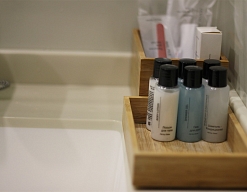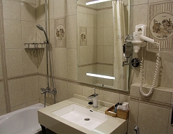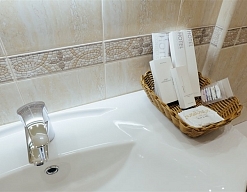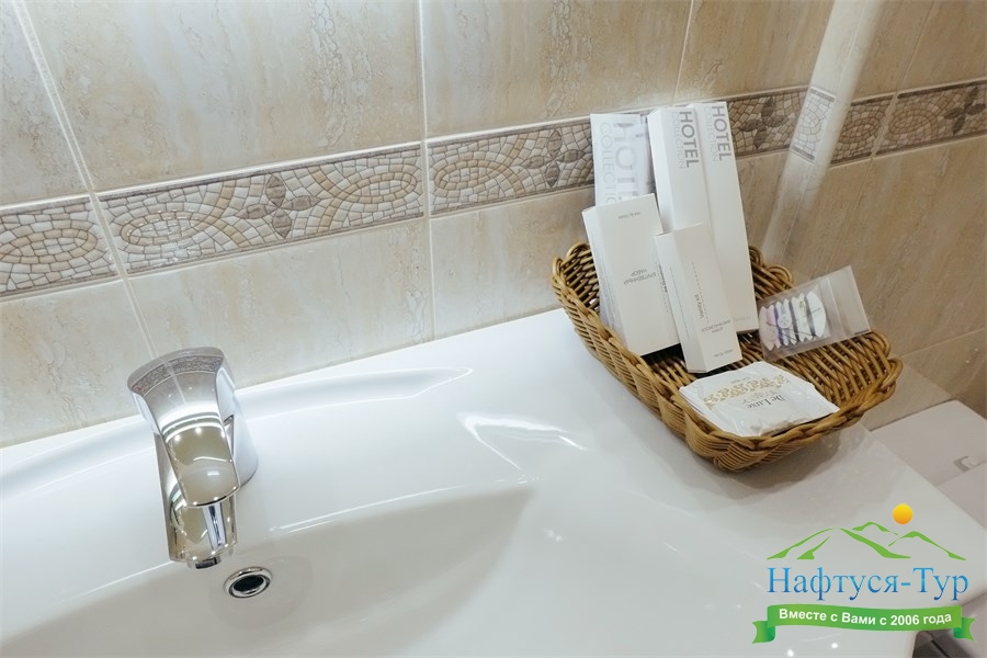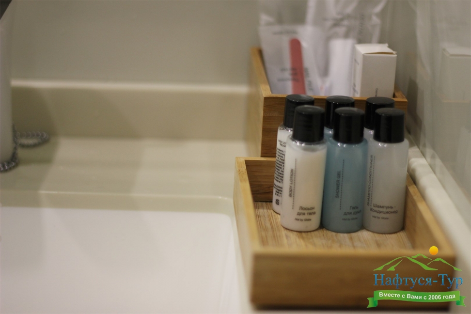 с душем, тапочки, туалетные принадлежности, фен, халат