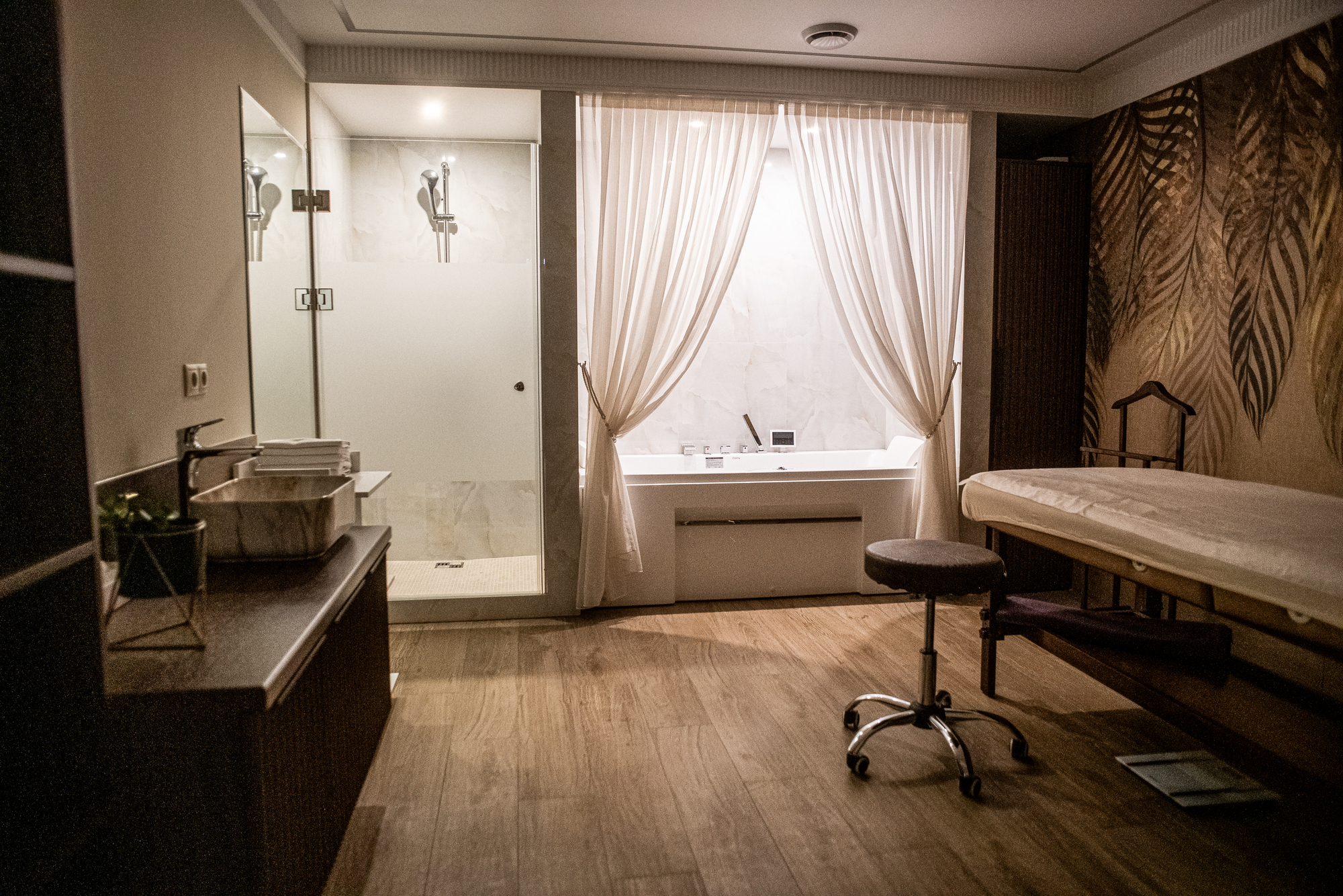 с душевой кабиной, тапочки, туалетные принадлежности, фен, халат