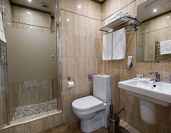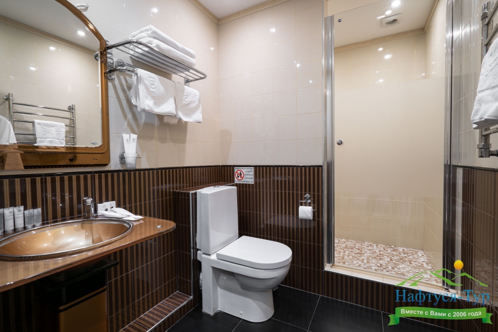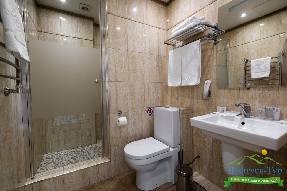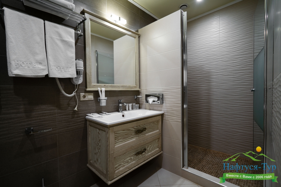 с душевой кабиной, тапочки, туалетные принадлежности, фен