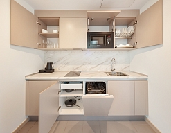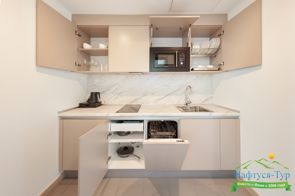 кондиционер, микроволновая печь, мини-холодильник, плита индукционная, посудомоечная машина, телефон, электрочайник