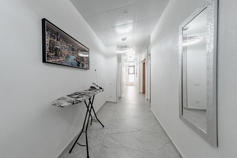 вешалка, зеркало, кровать двуспальная, прикроватные тумбочки, стол, шкаф
