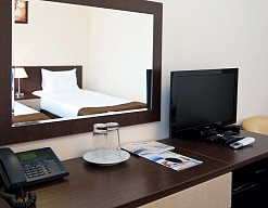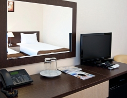 зеркало, кровати односпальные, прикроватная тумбочка, стол, стулья, шкаф