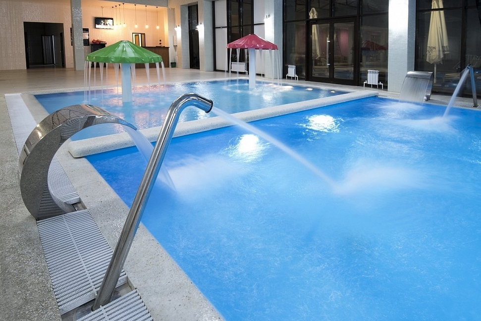 детский бассейн, 7х5, с предельной глубиной 30 сантиметров, которые отделены бортиками от больших бассейнов — крытого и открытого.
