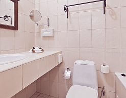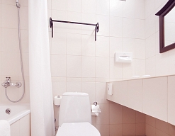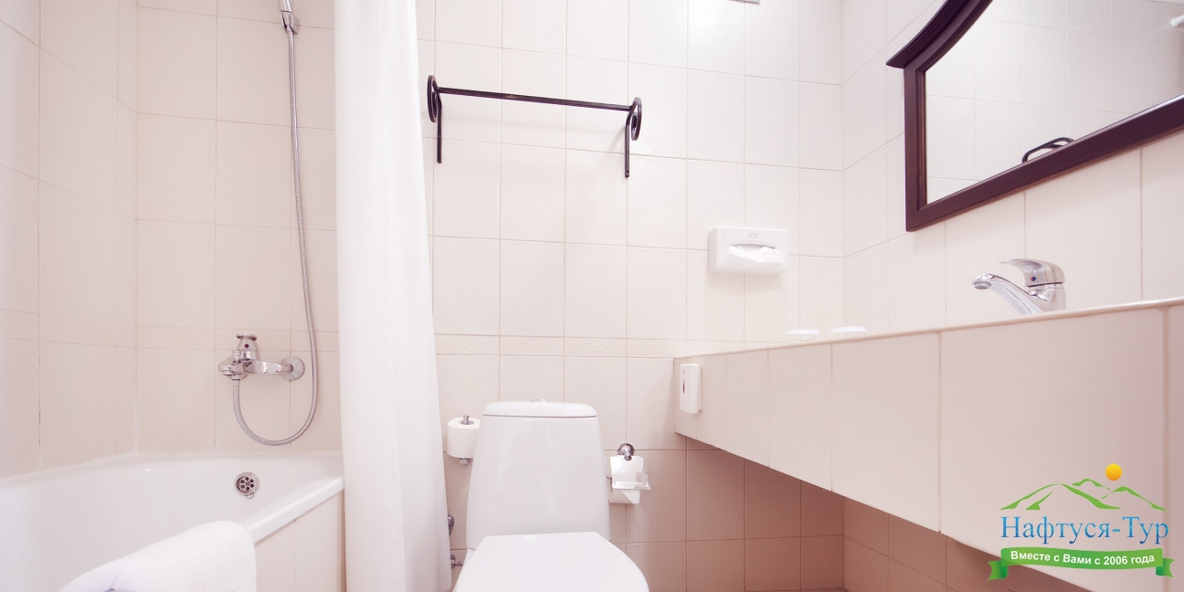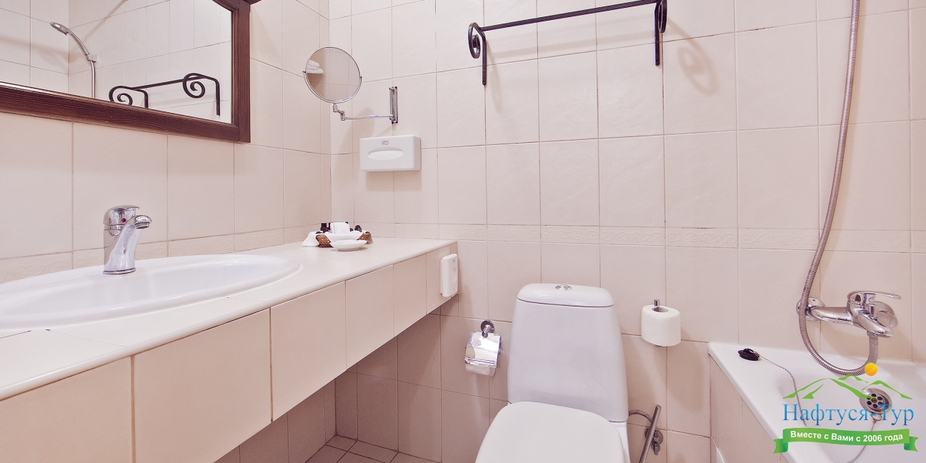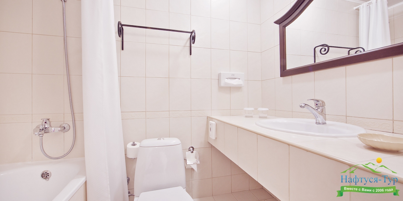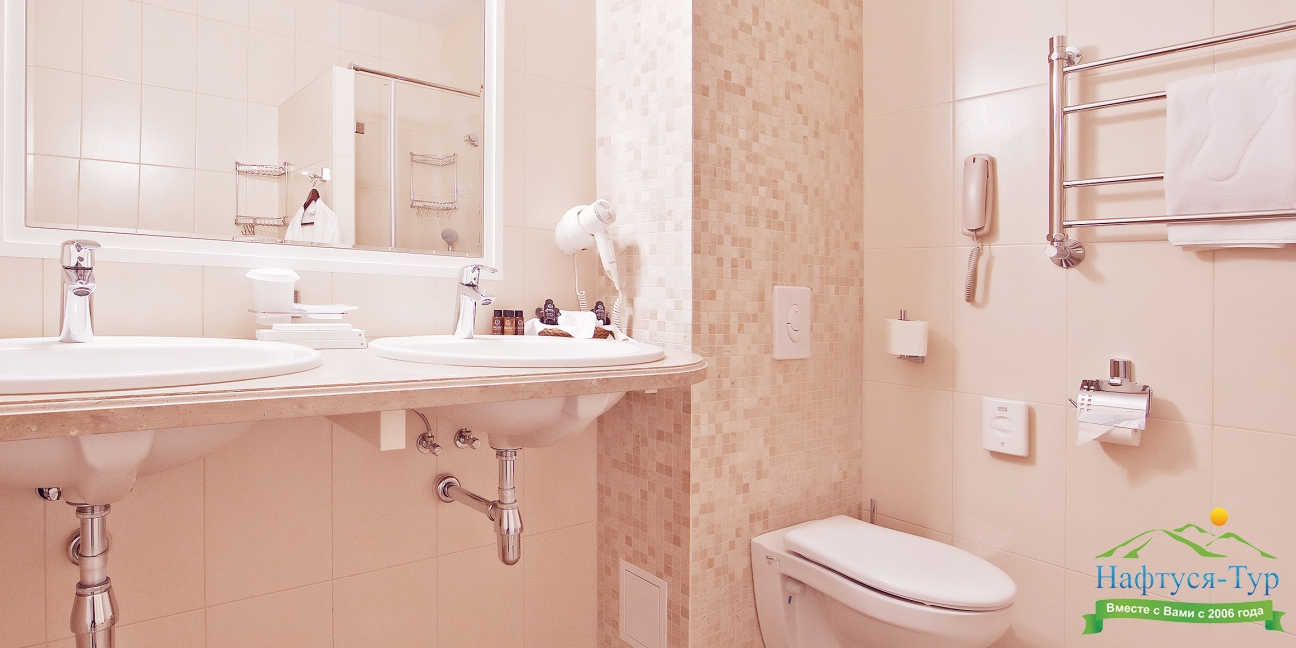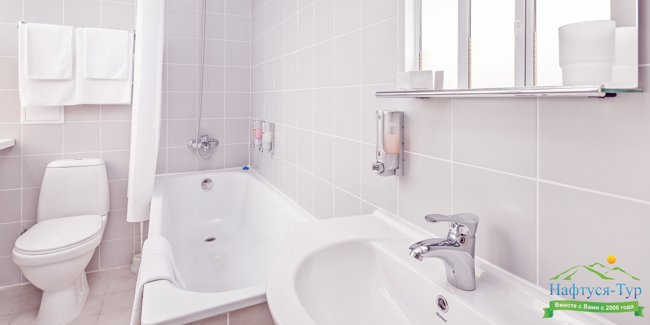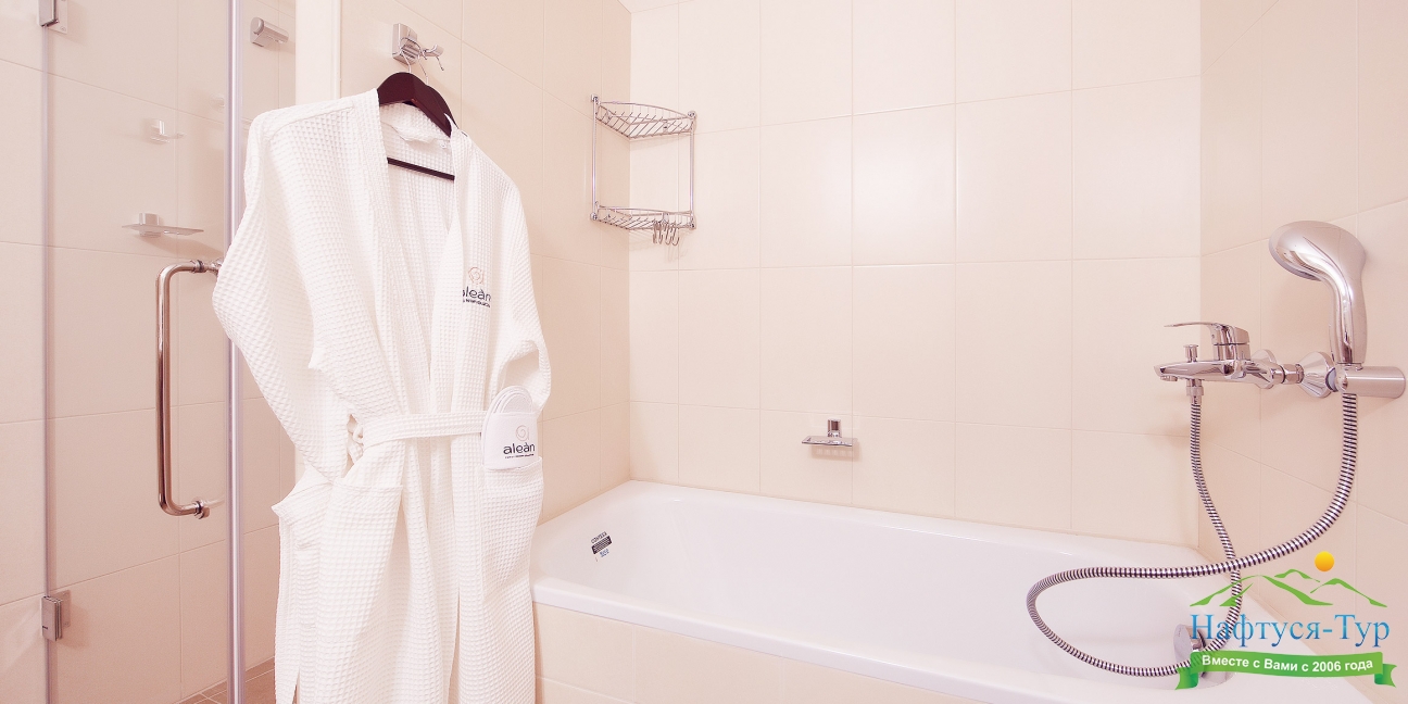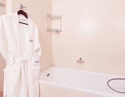 с ванной, тапочки, туалетные принадлежности, фен, халат