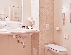 с ванной или душевой кабиной, тапочки, фен, халат