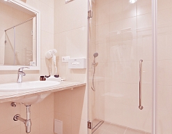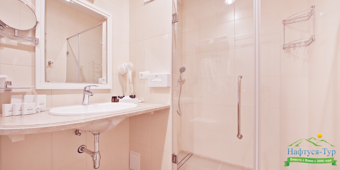 с душевой кабиной, тапочки, туалетные принадлежности, фен, халат