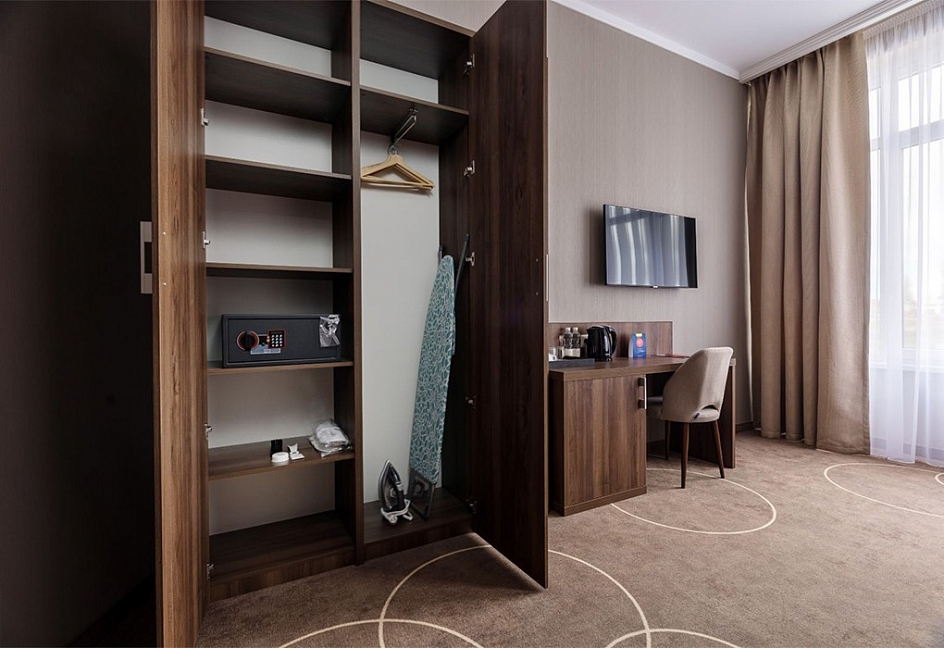 гладильная доска, мини-холодильник, набор посуды, сейф, сплит-система, телевизор ЖК, телефон, утюг, электрочайник