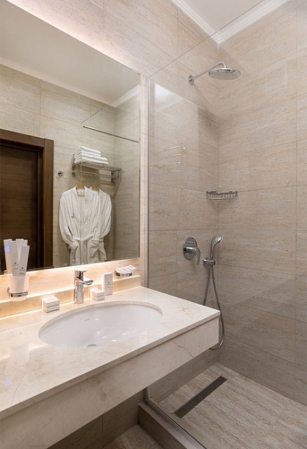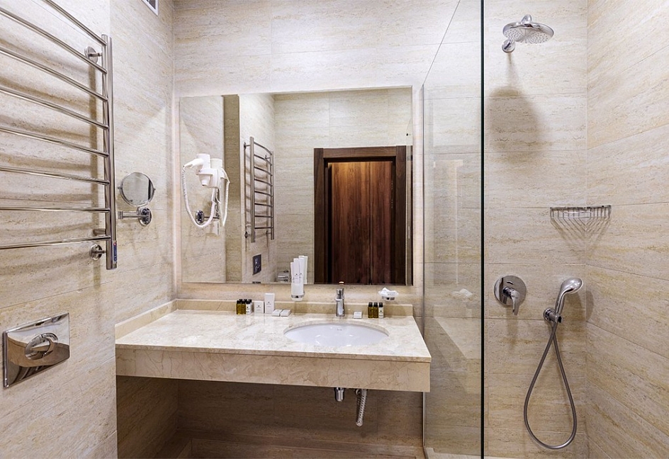 с душем, тапочки, туалетные принадлежности, фен, халат