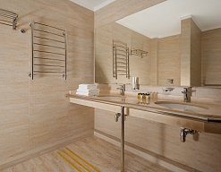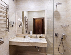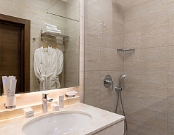с ванной, с душем, тапочки, туалетные принадлежности, фен, халат