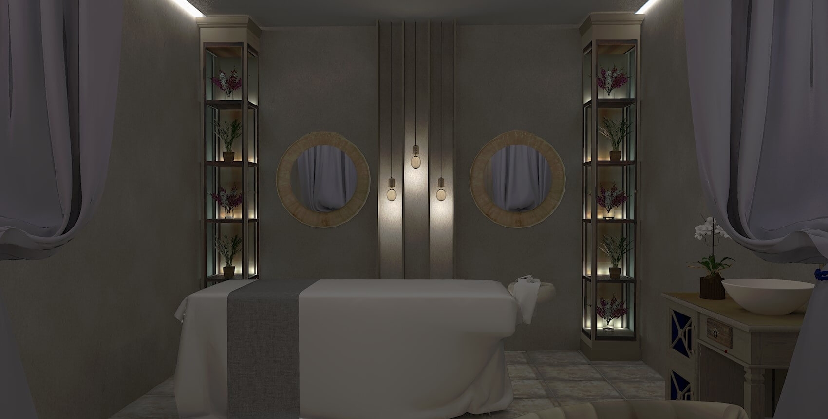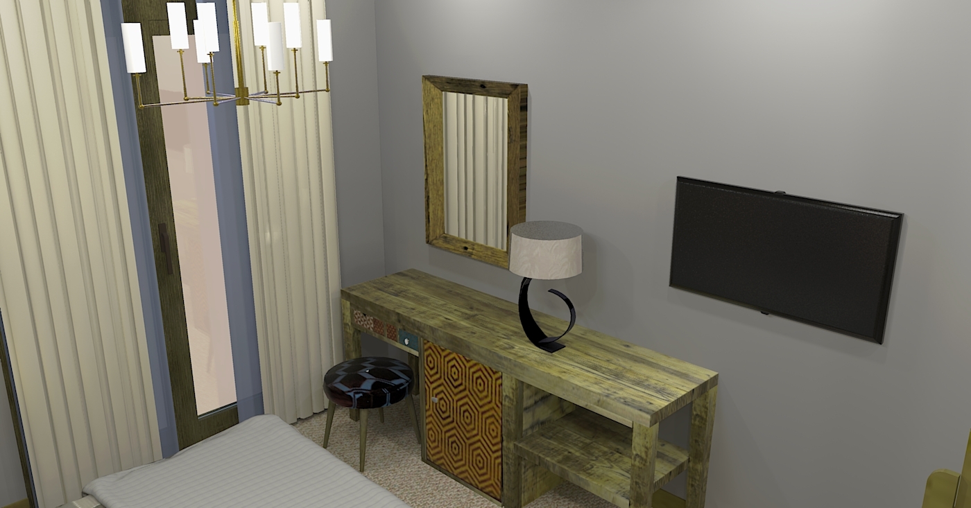 вешалка, зеркало, кресло-кровать, кровать двуспальная, прикроватные тумбочки, стол, стулья, шкаф