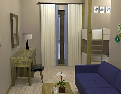 вешалка, зеркало, кресло-кровать, кровать двуспальная, кровать двухъярусная, прикроватные тумбочки, стол, стулья, шкаф