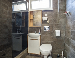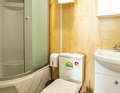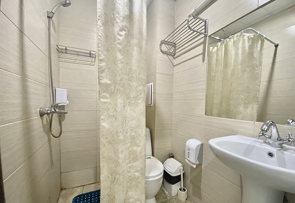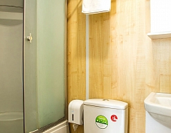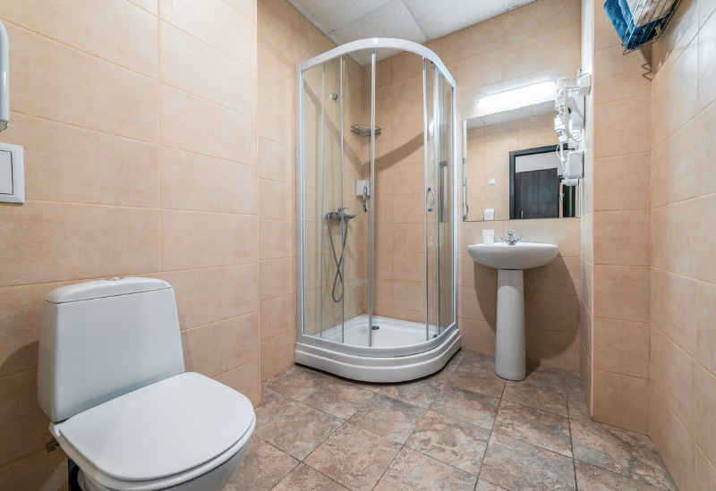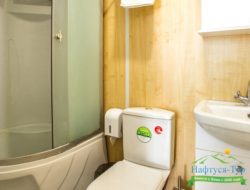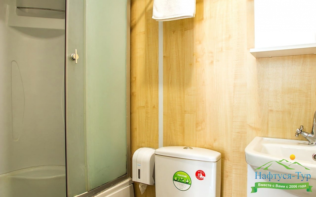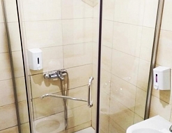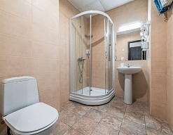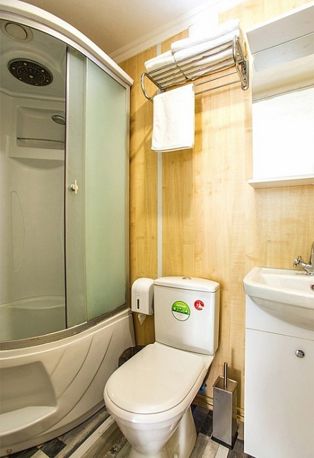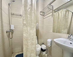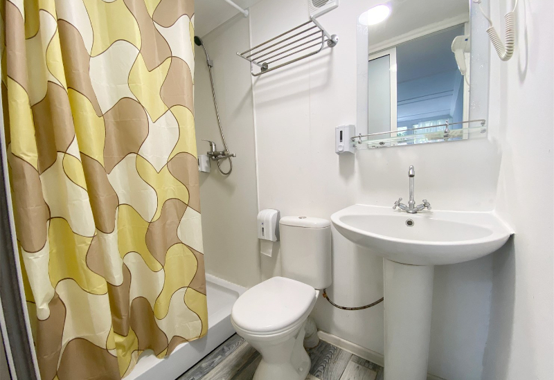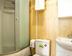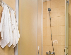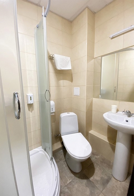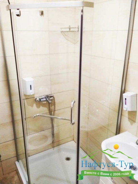 с душевой кабиной, туалетные принадлежности, фен