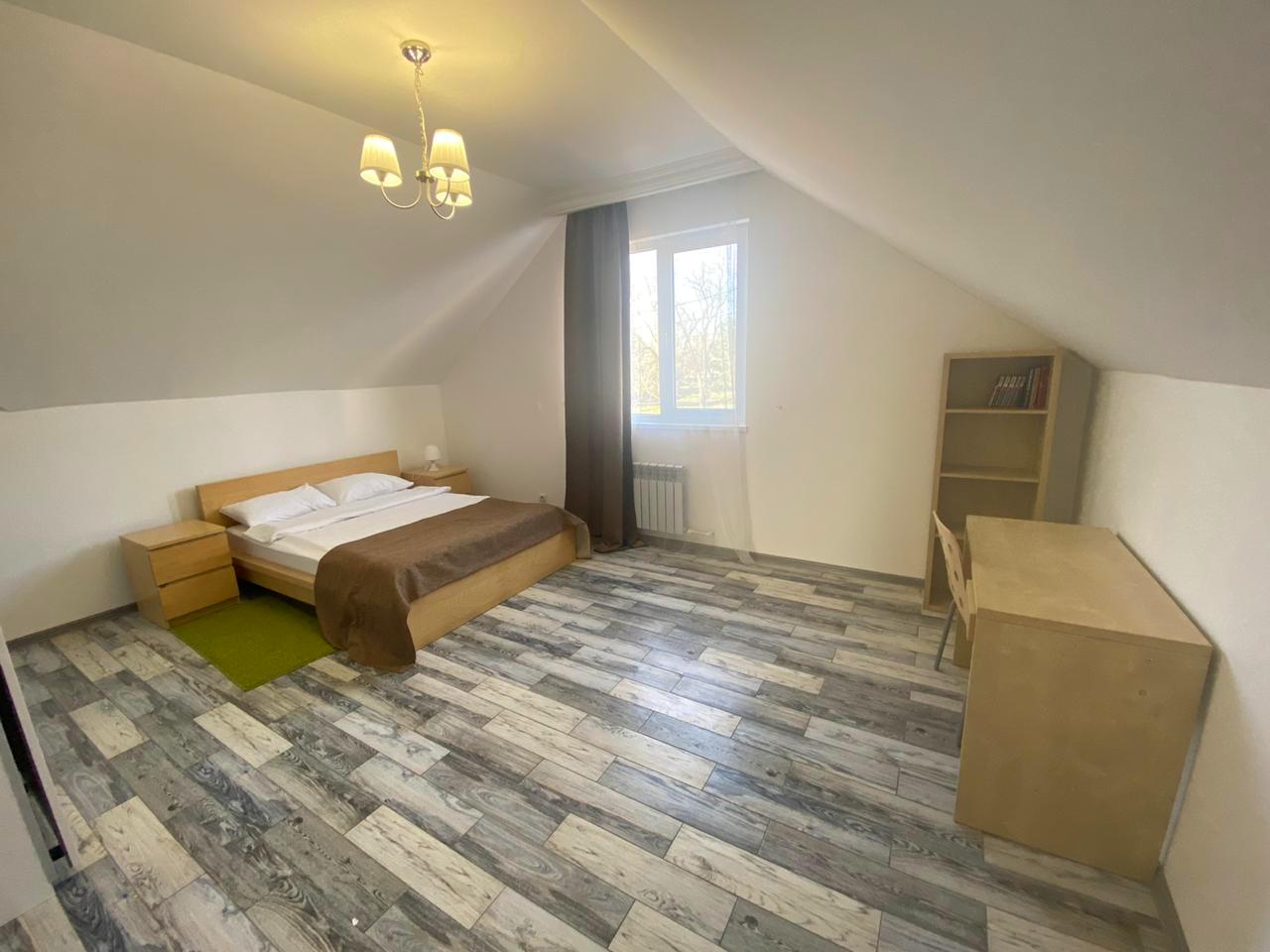 вешалка, зеркало, кровать двуспальная, прикроватные тумбочки, стол, стулья, шкаф