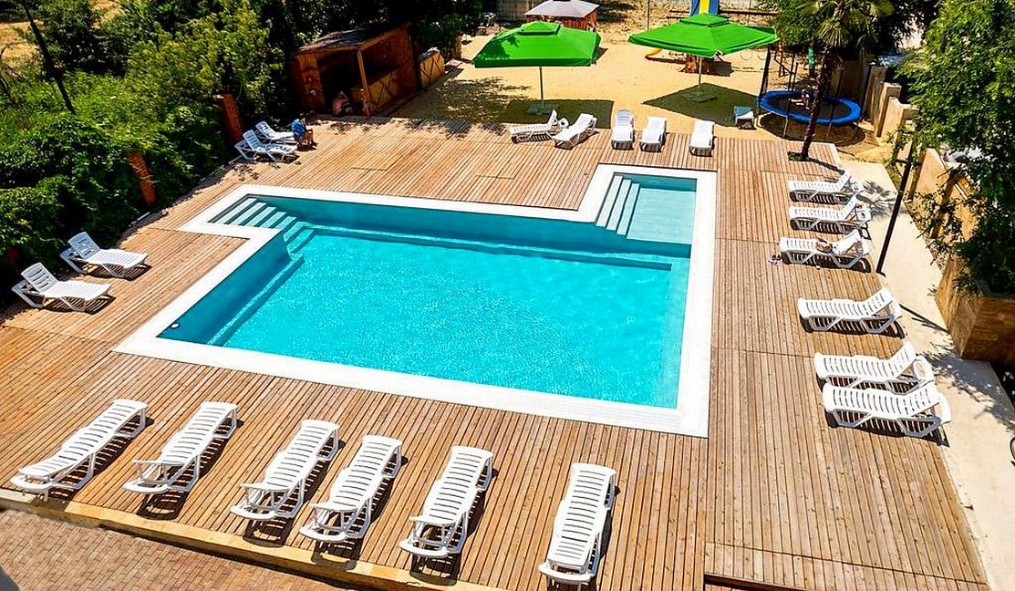 Открытый бассейн с оборудованной зоной для отдыха