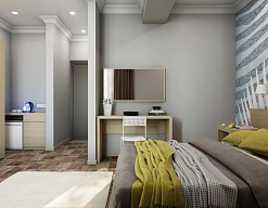 вешалка, зеркало, кресло-кровать, кровать двуспальная, прикроватные тумбочки, стол, стулья, шкаф