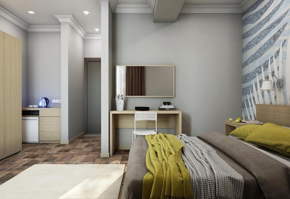 вешалка, диван, зеркало, кровати односпальные /одна двуспальная кровать, прикроватные тумбочки, стол, стулья, шкаф