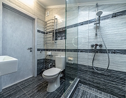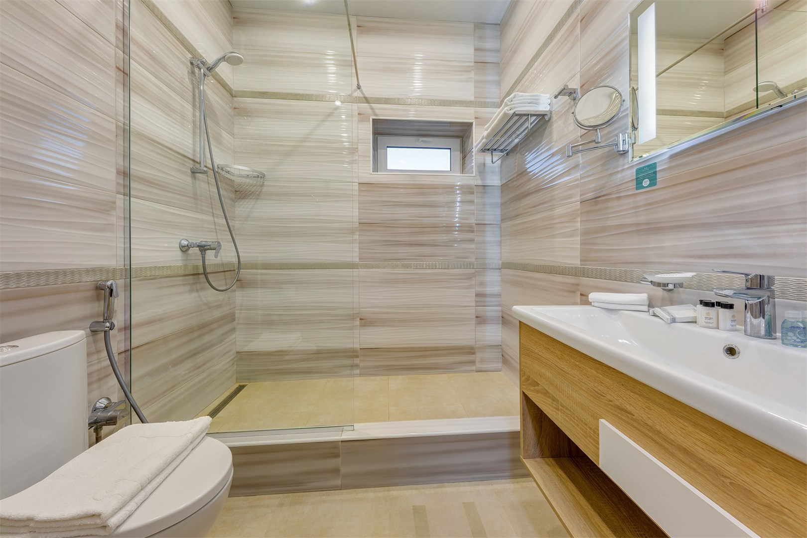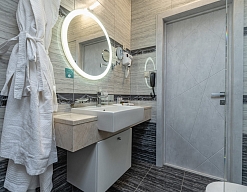 с душем, тапочки, туалетные принадлежности, фен, халат