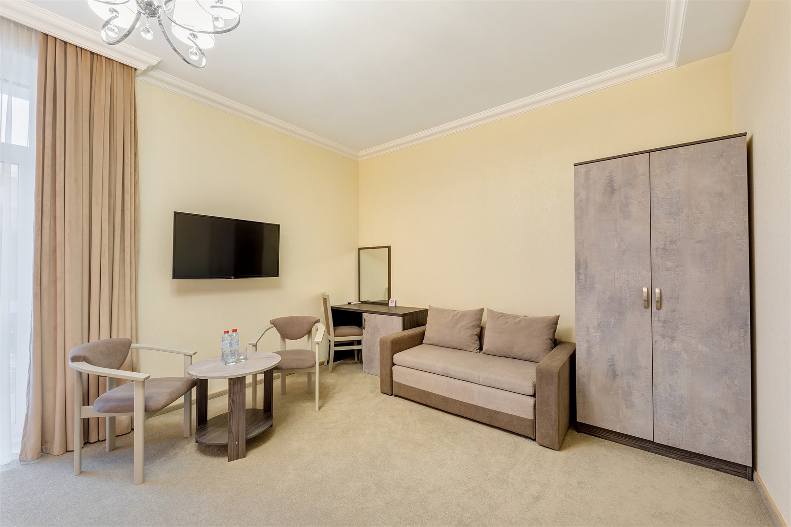 вешалка, диван, зеркало, кровать двуспальная, кровать односпальная, прикроватные тумбочки, стол, стулья, шкаф
