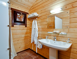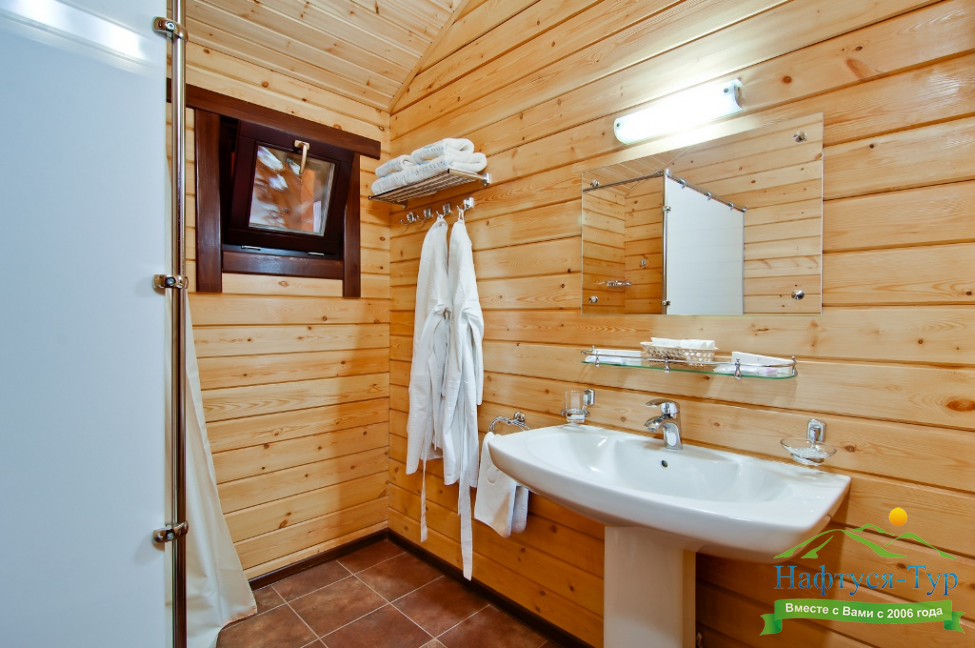 с душем, тапочки, туалетные принадлежности, фен, халат