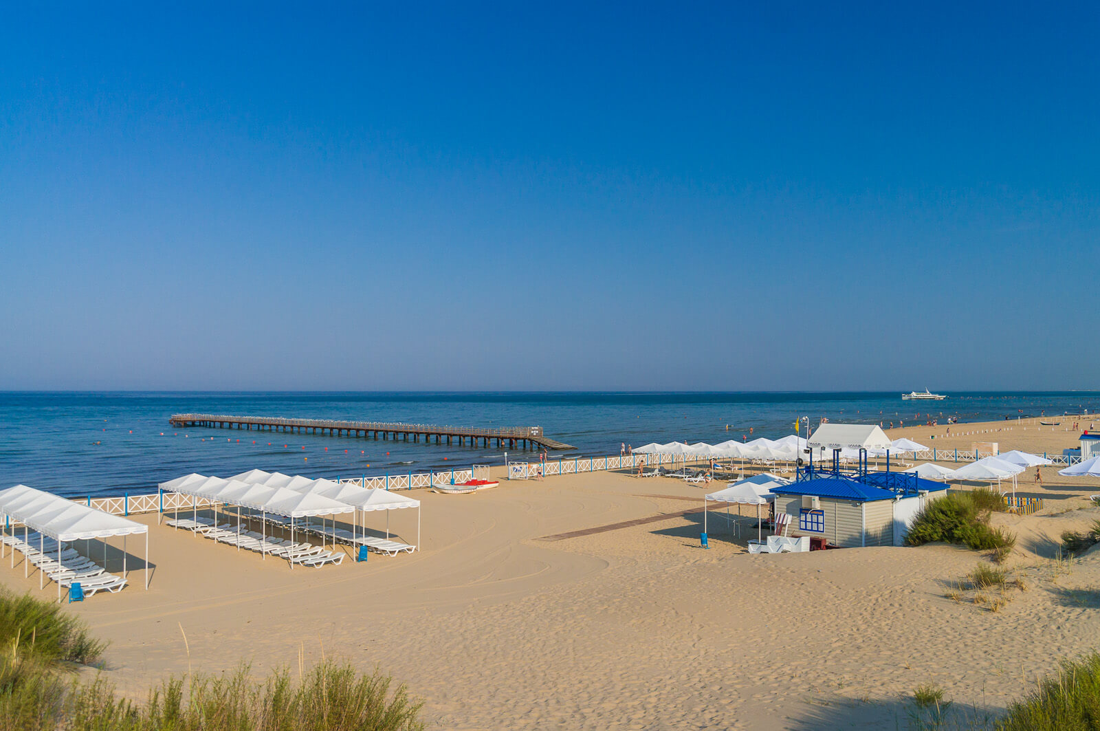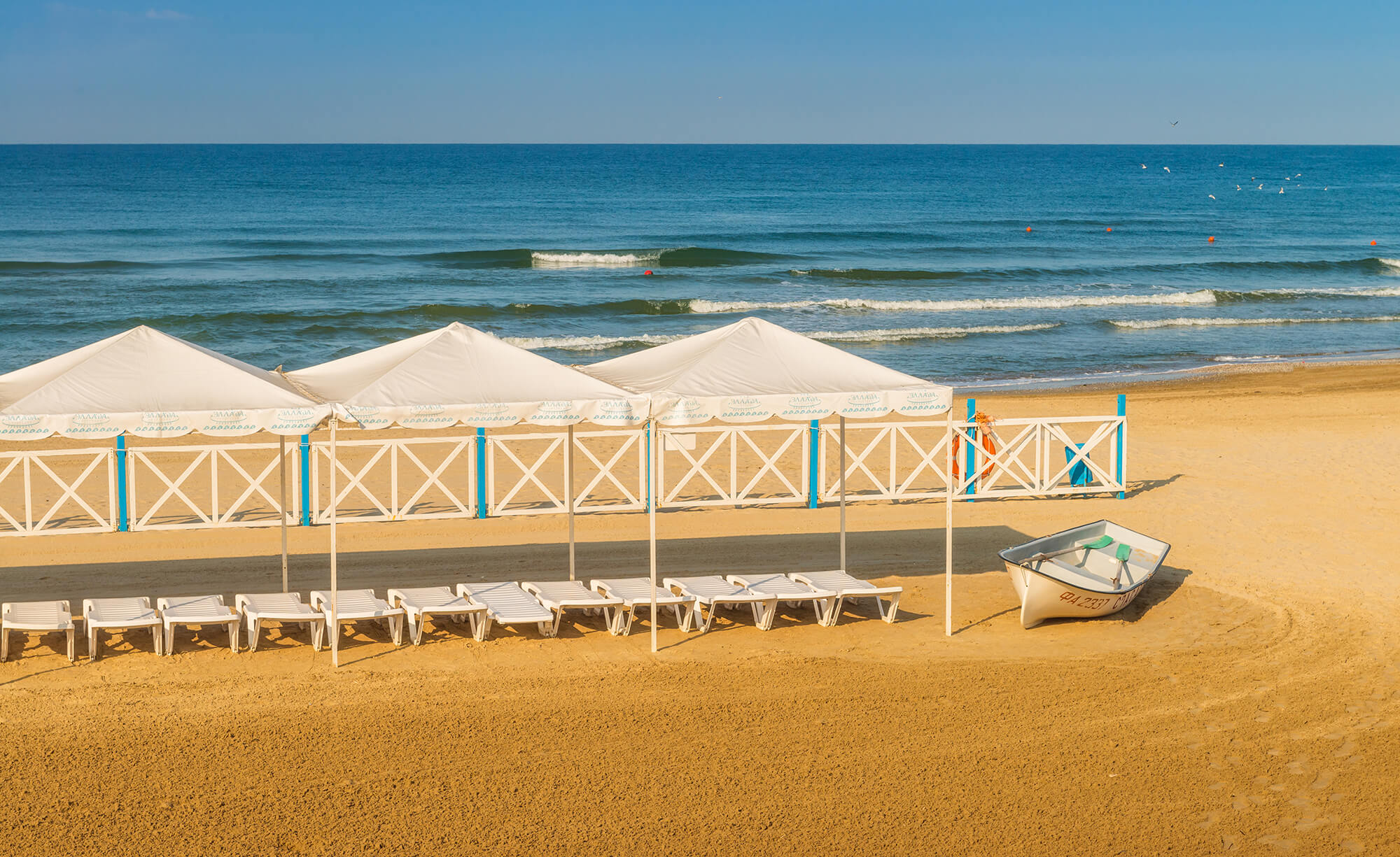 Огромный собственный пляж курорта оборудован всем необходимым для комфортного отдыха наших гостей — зонты, шезлонги, теневые навесы, раздевалки и души.