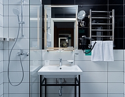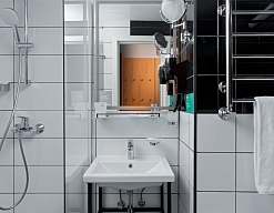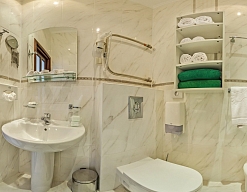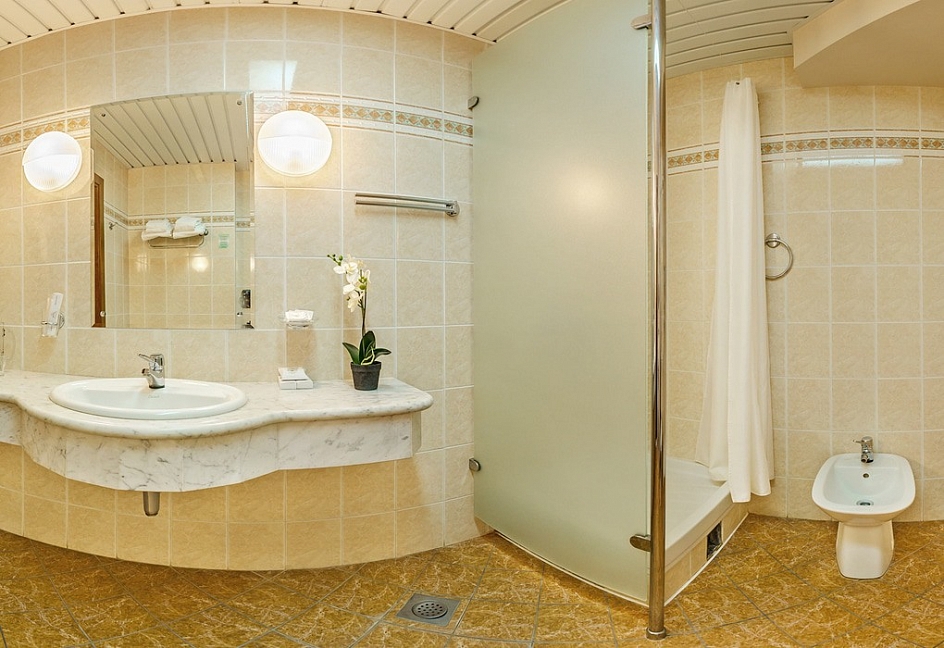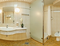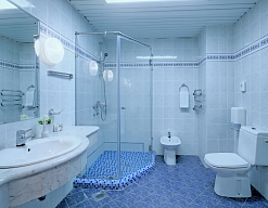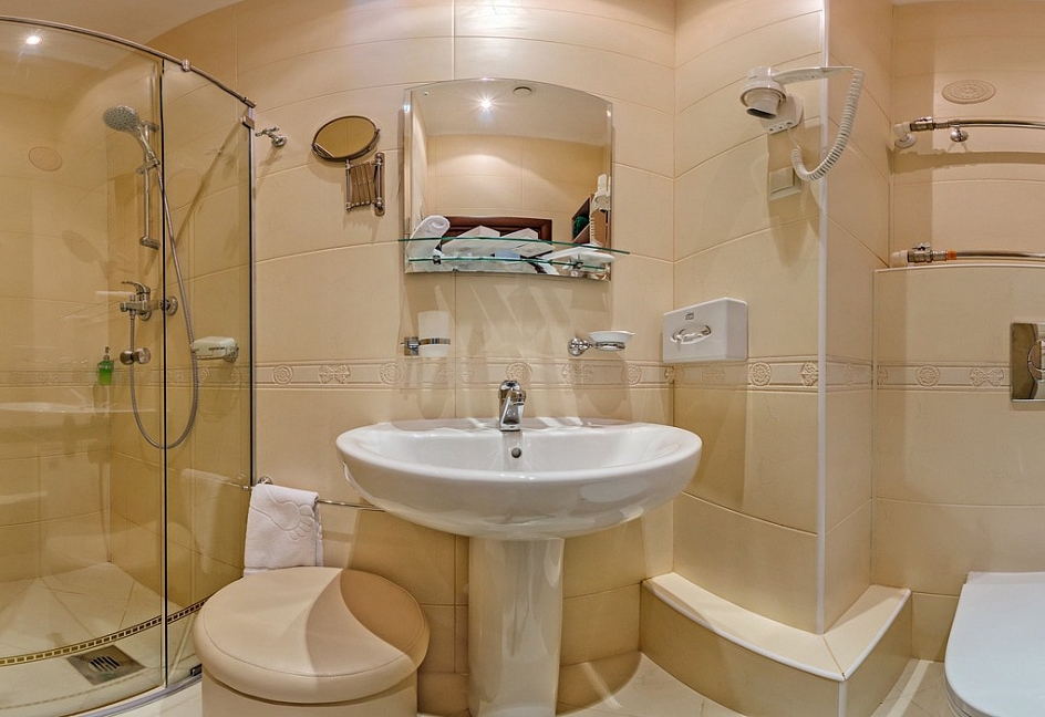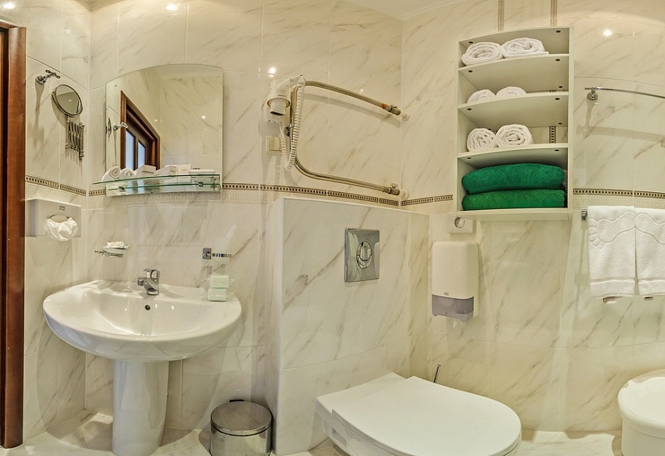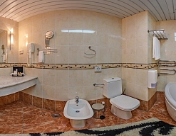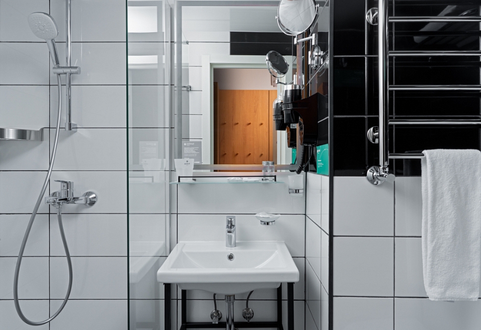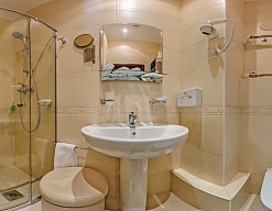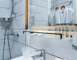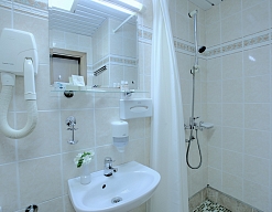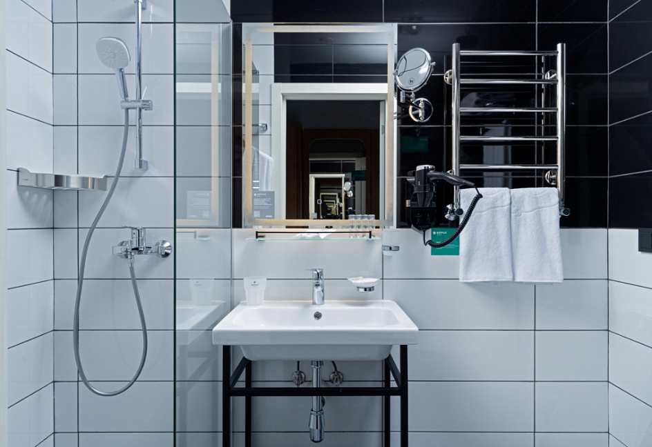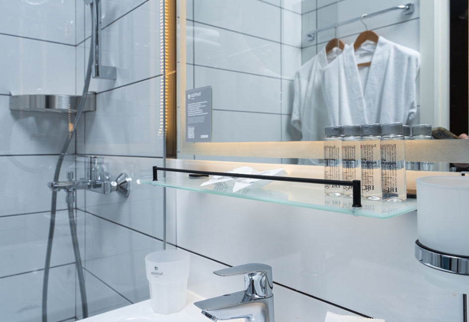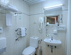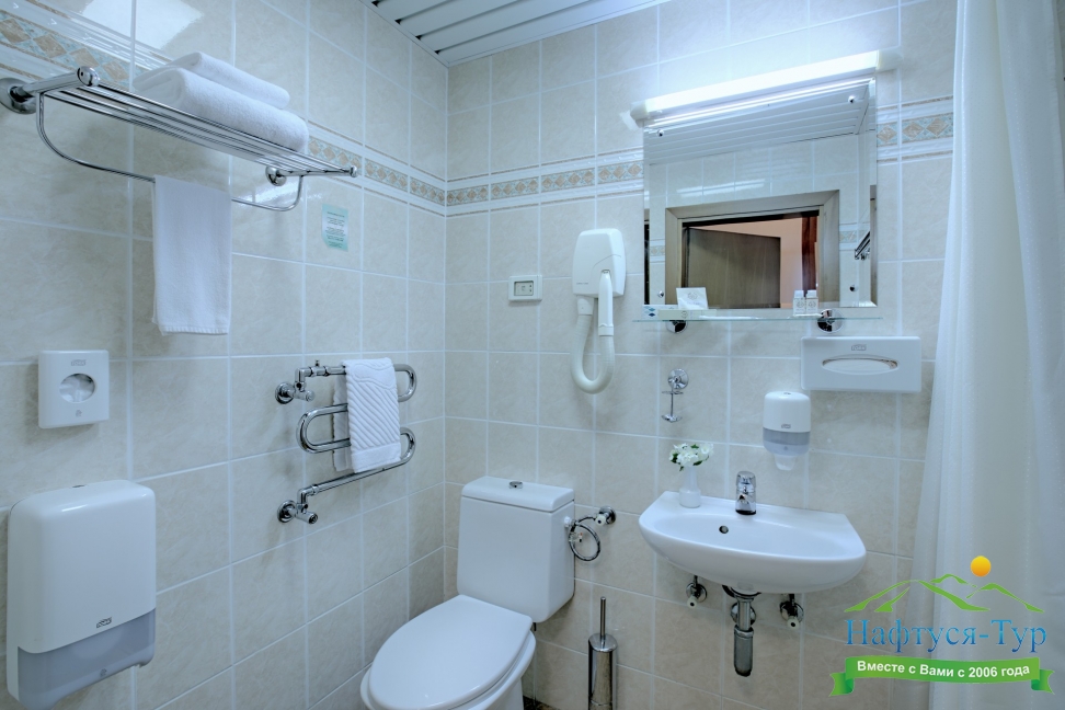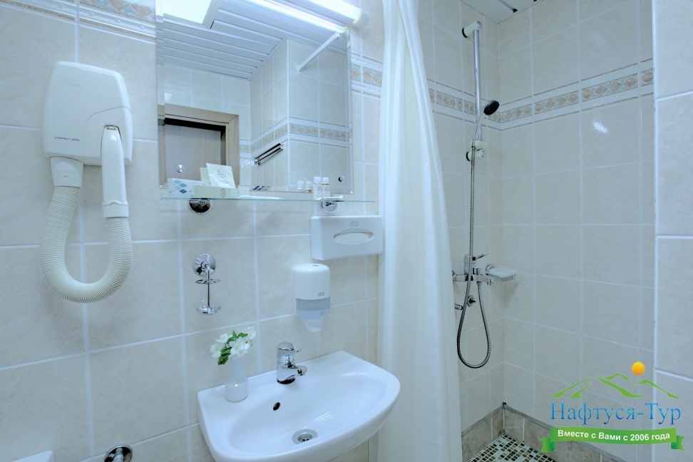 с душем (поддон), тапочки, туалетные принадлежности, фен, халат