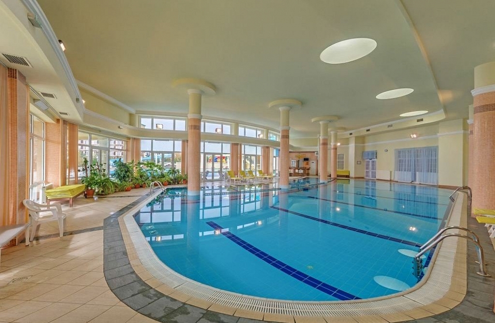 - крытый: 210 кв. м, вода пресная, детское отделение, входит в стоимость, работает круглогодично.