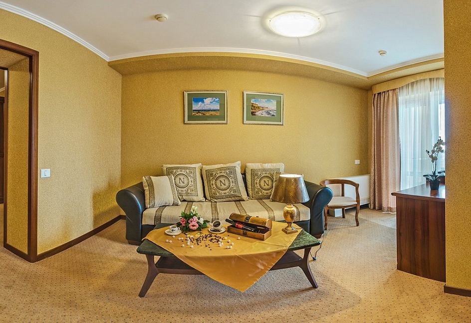 Проживание, питание 3-разовое "шведский стол", лечение, пользование бассейнами, тренажёрным залом, спортплощадкой, услугами детского игрового клуба, автостоянкой., пользование оборудованным пляжем (в летний период)