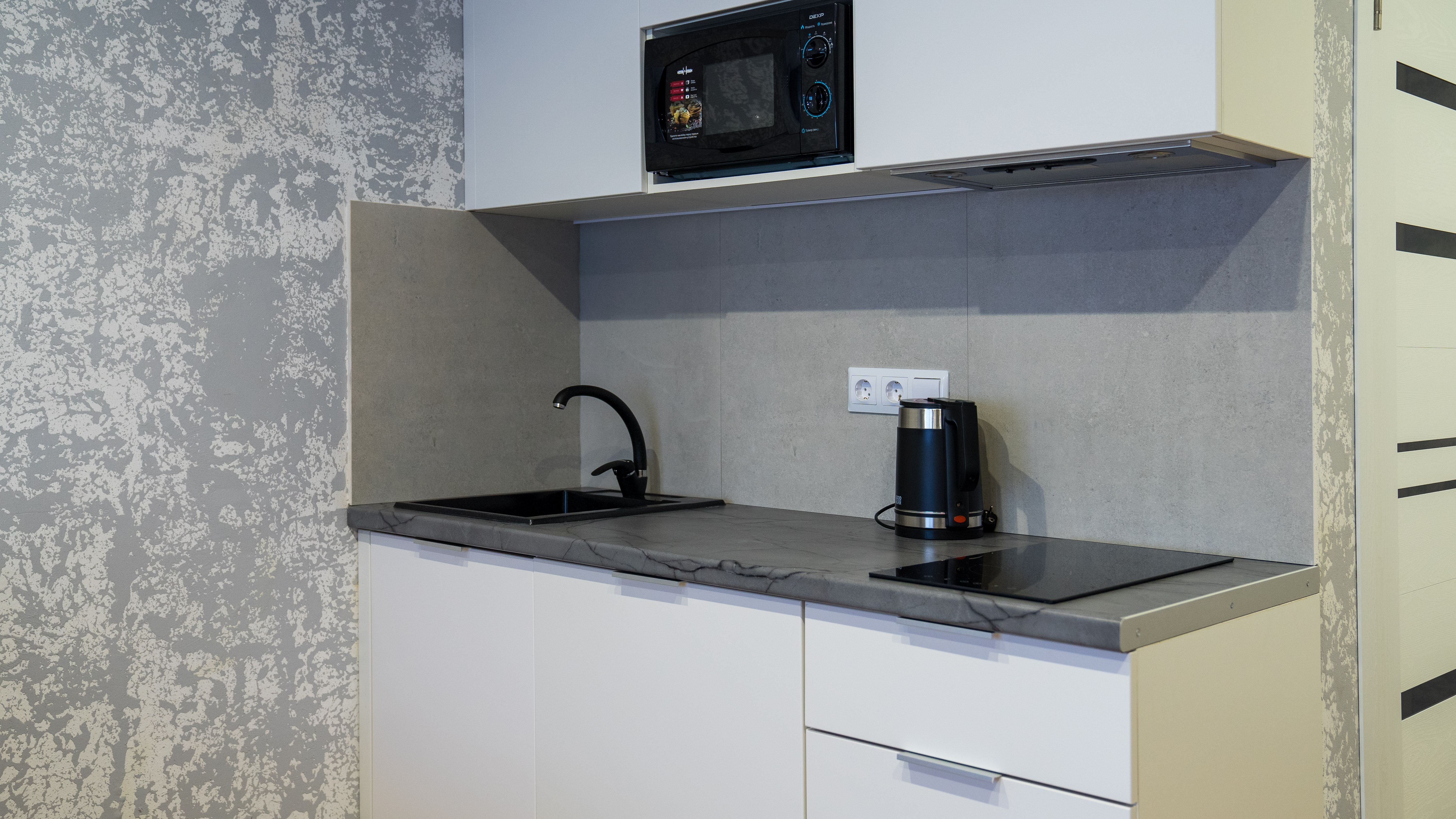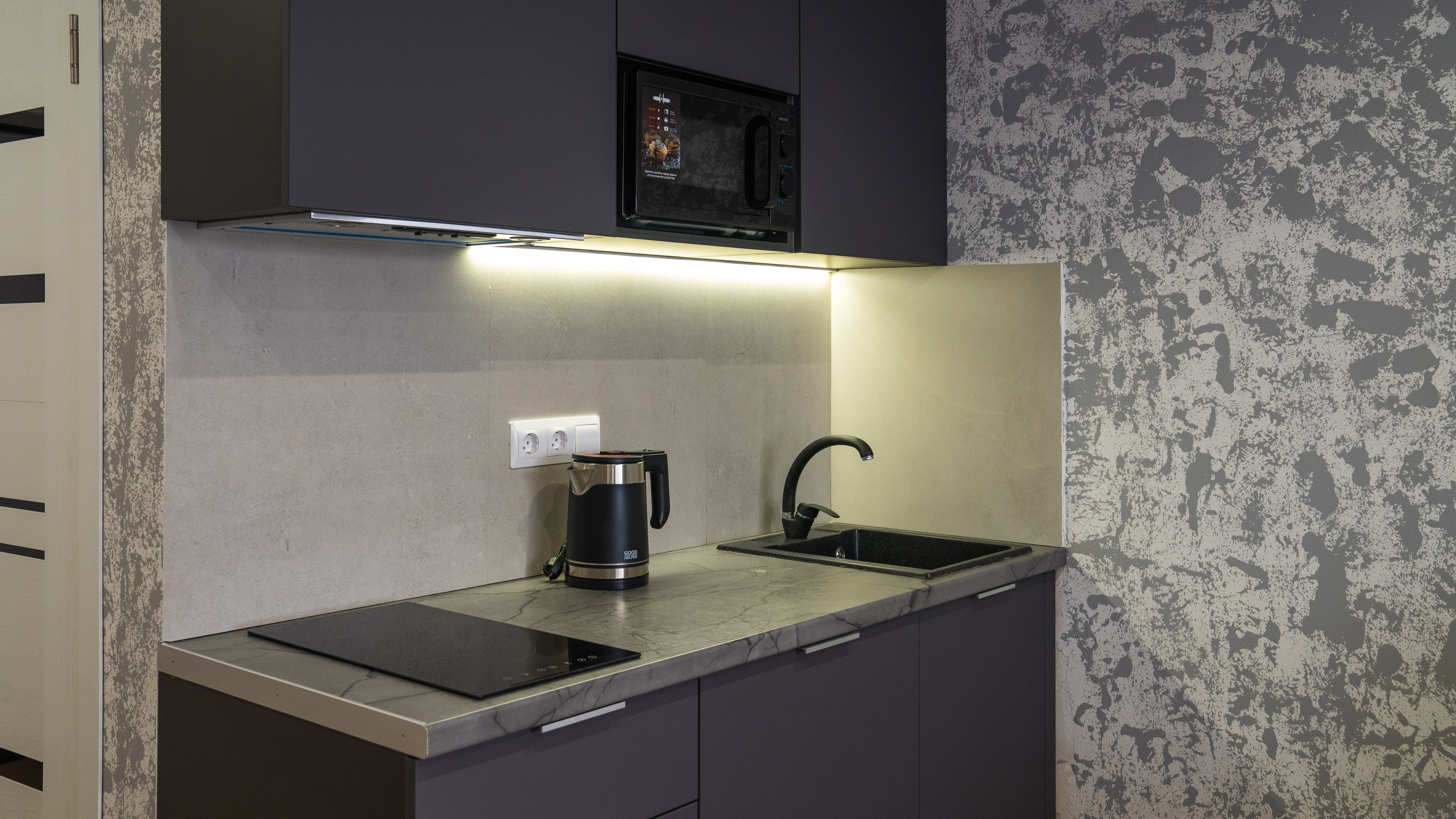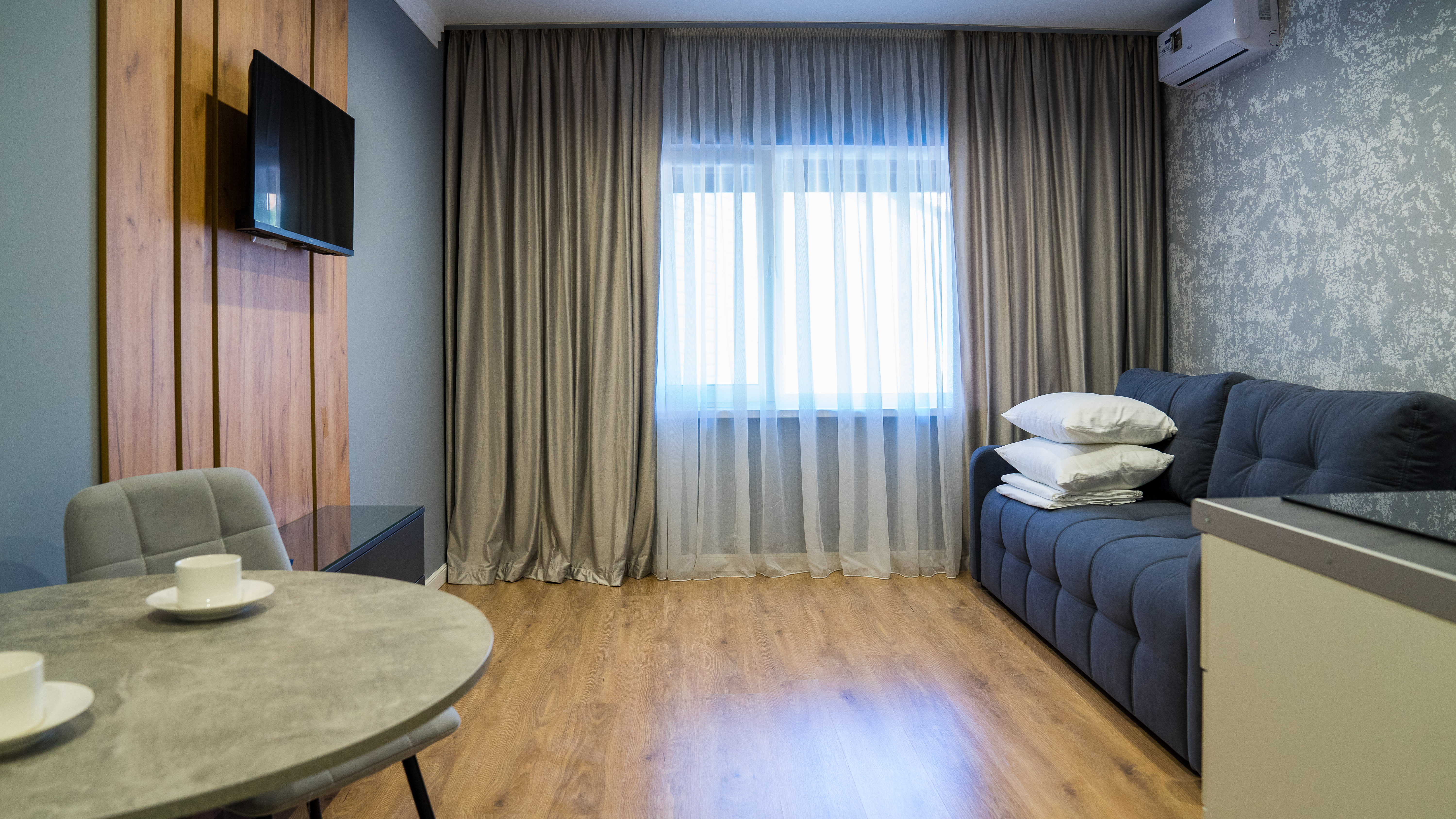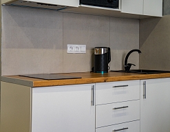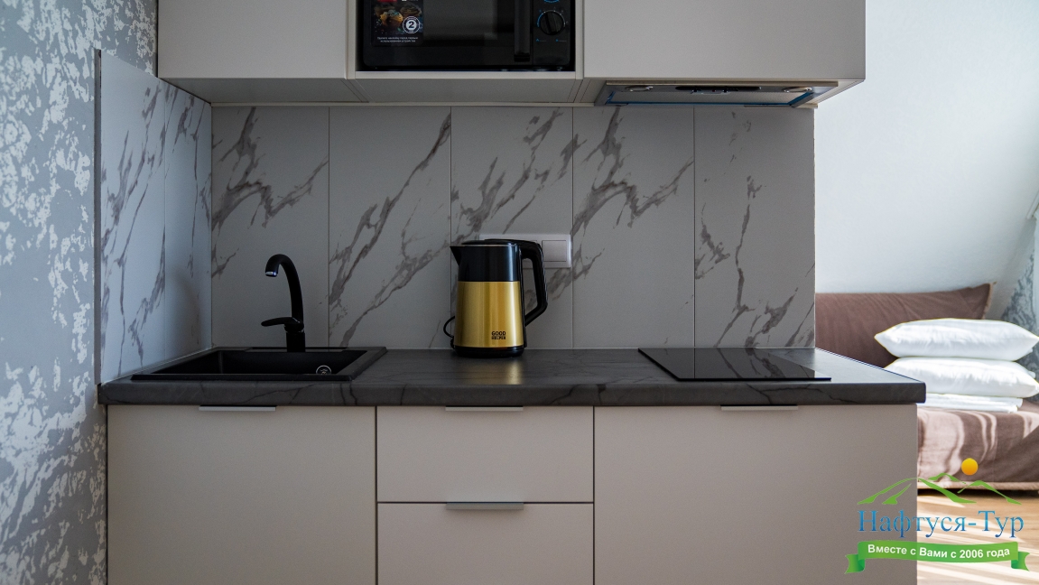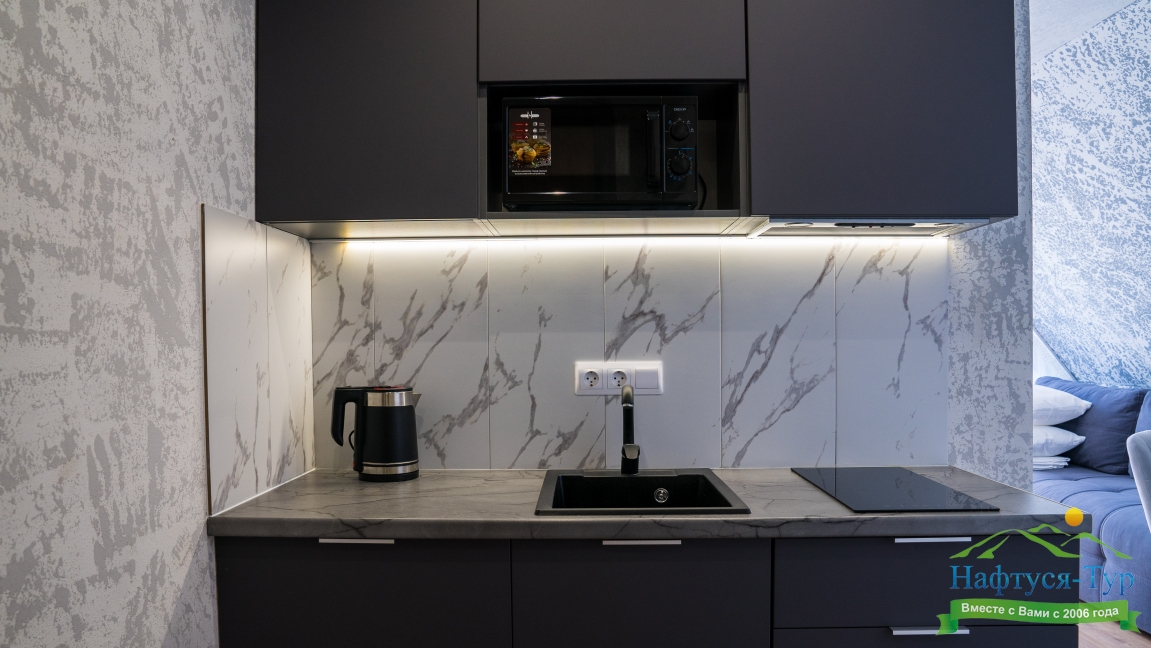 кондиционер, микроволновая печь, мини-холодильник, набор посуды, плита электрическая, телевизор ЖК, чайный набор посуды, электрочайник
