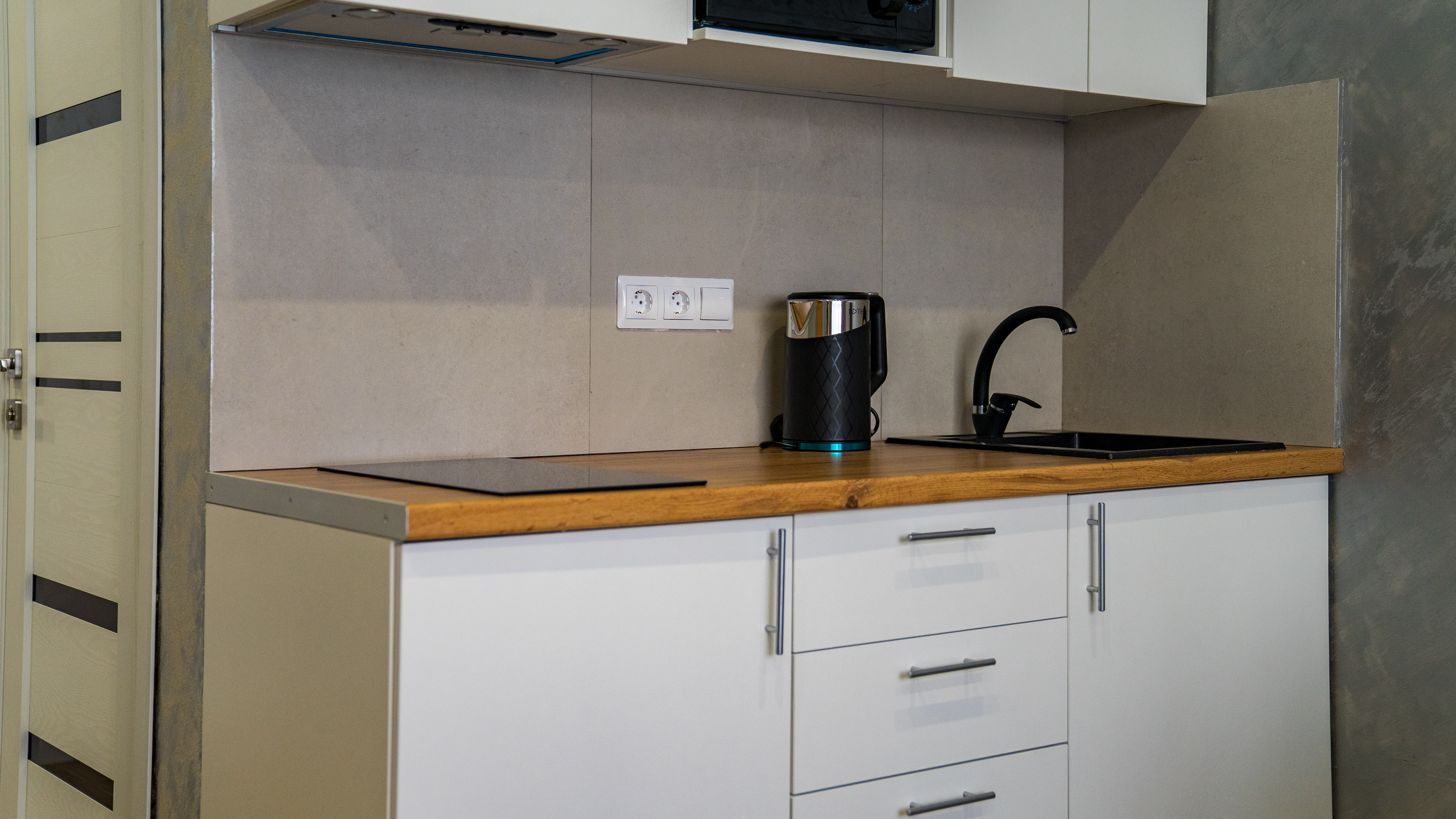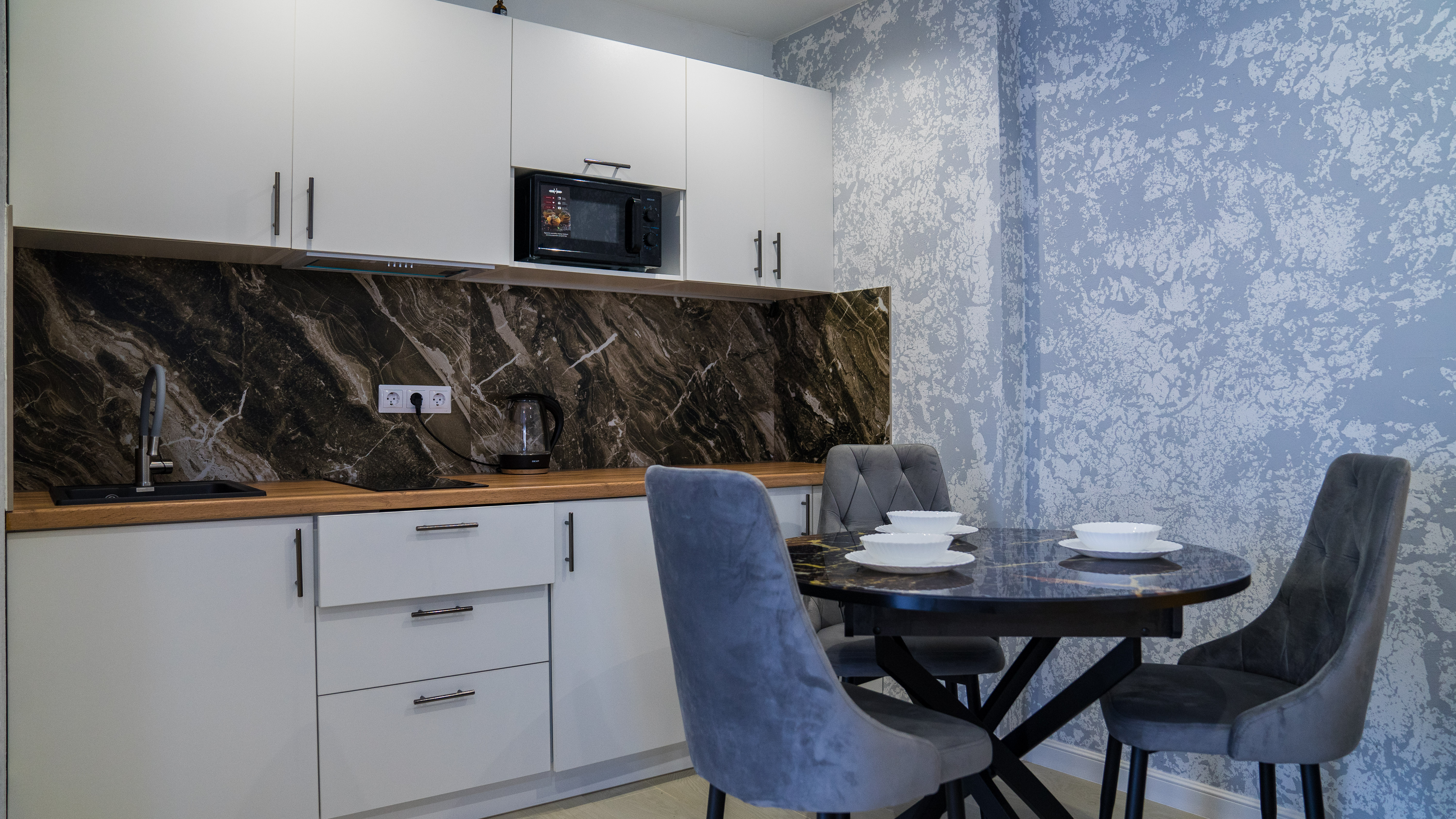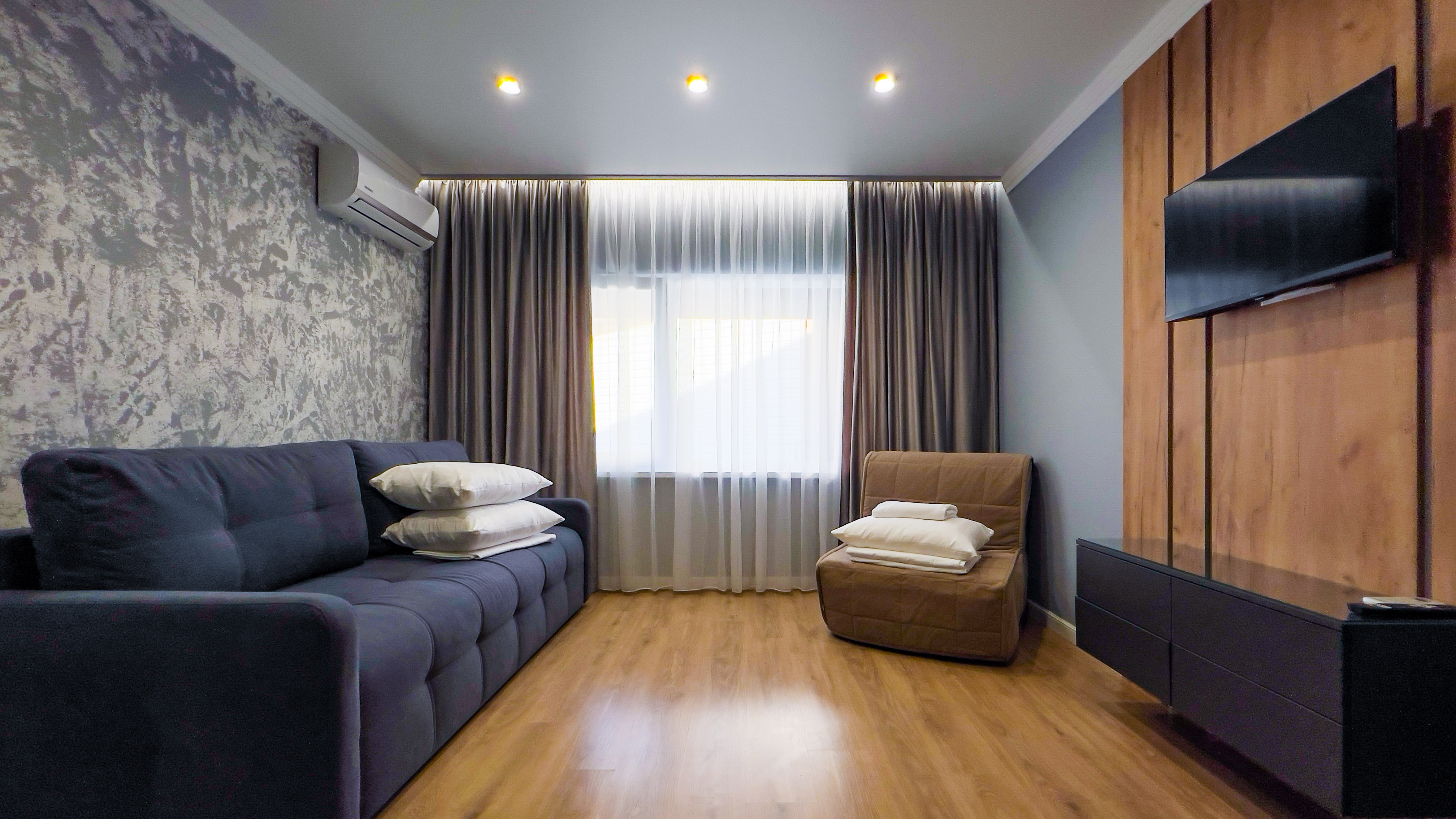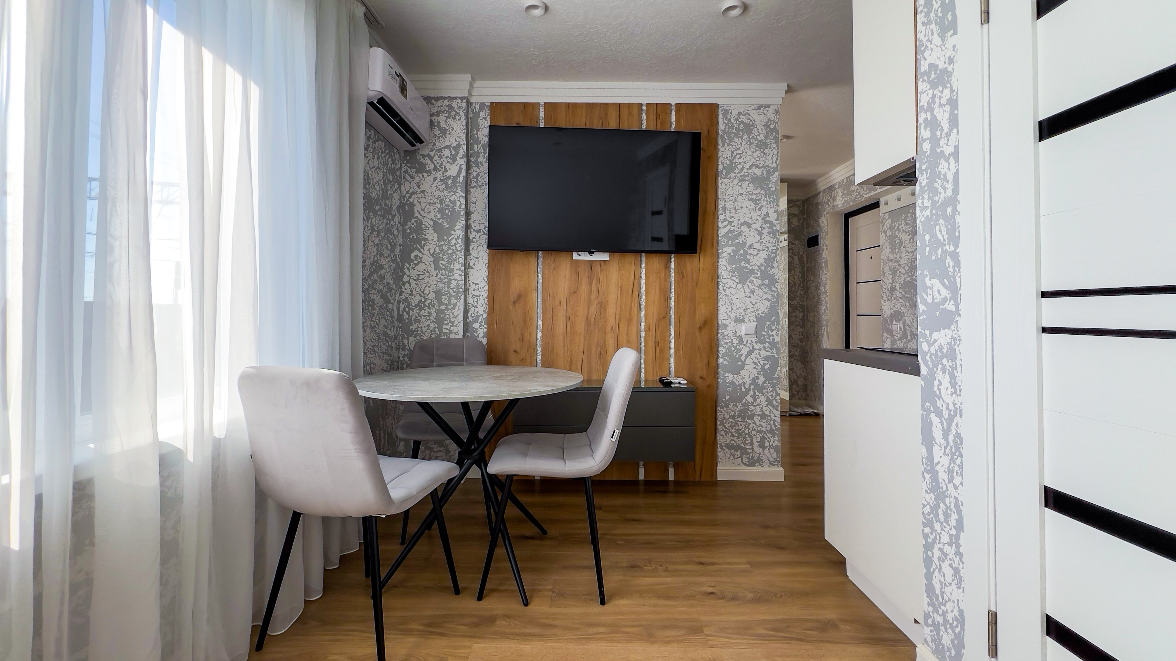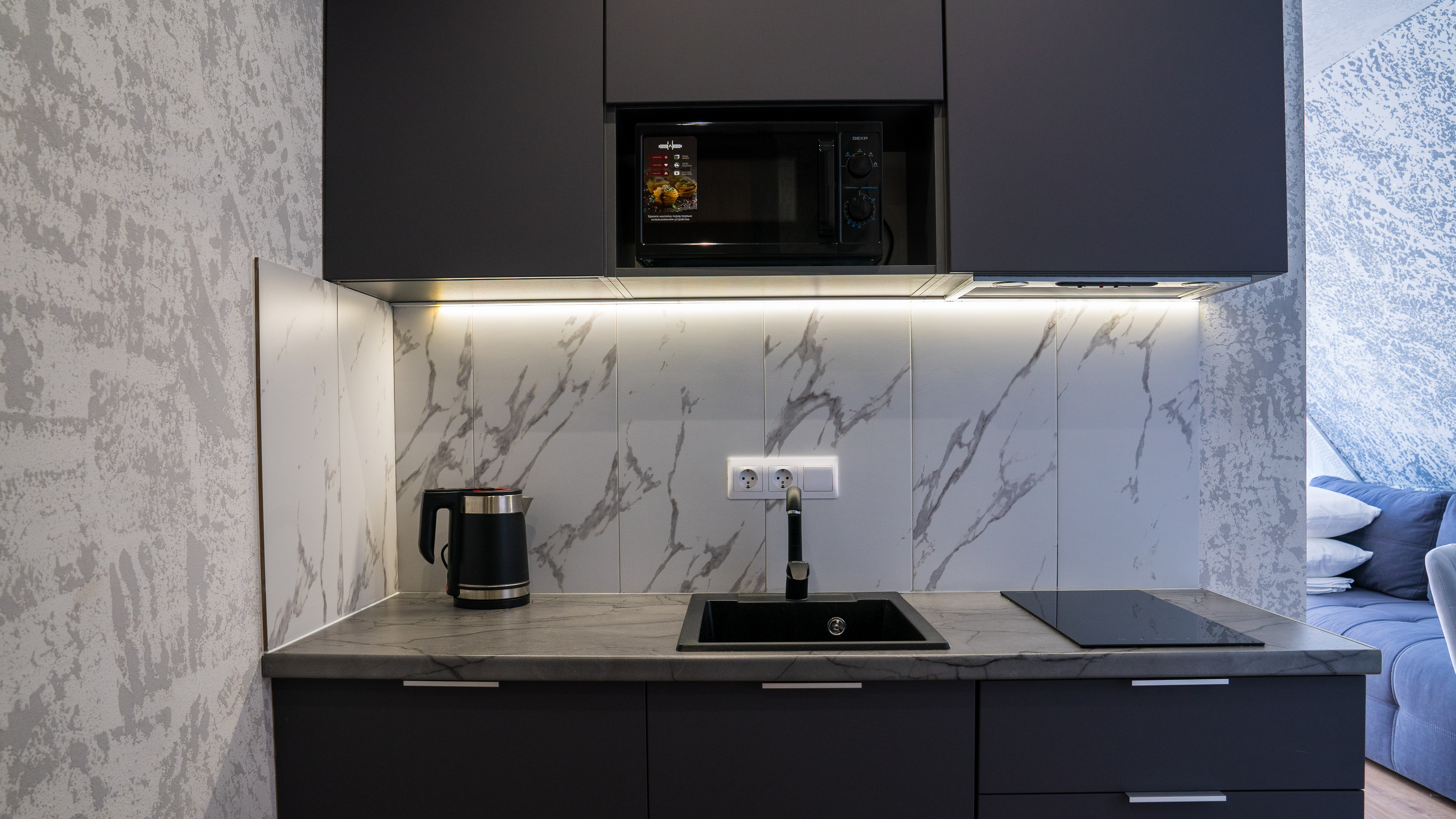 кондиционер, микроволновая печь, мини-холодильник, набор посуды, плита электрическая, телевизор ЖК, чайный набор посуды, электрочайник