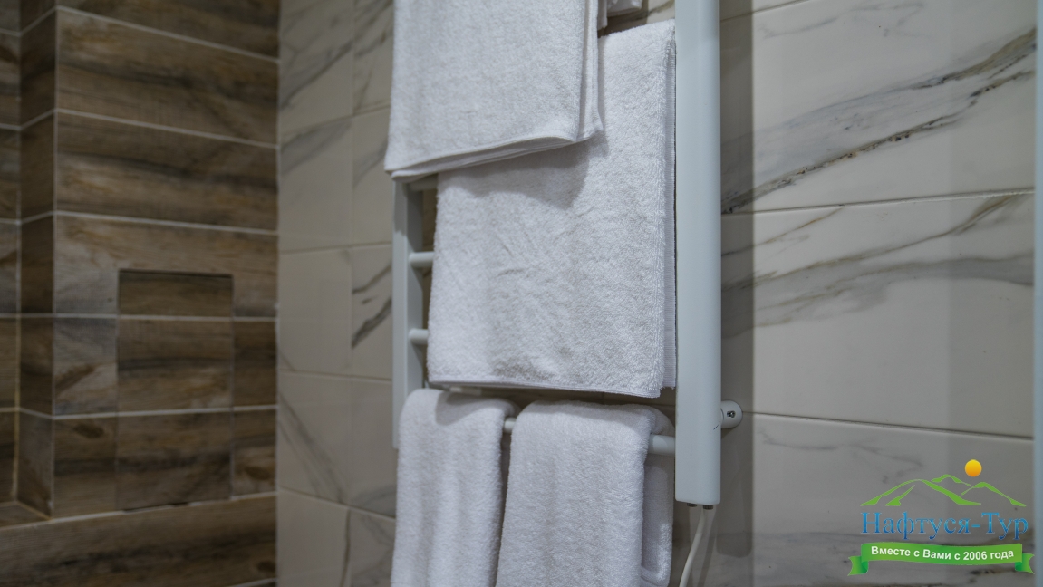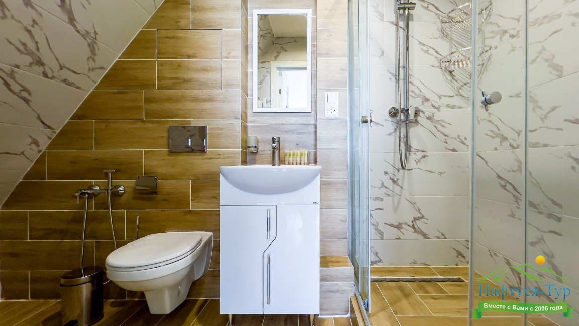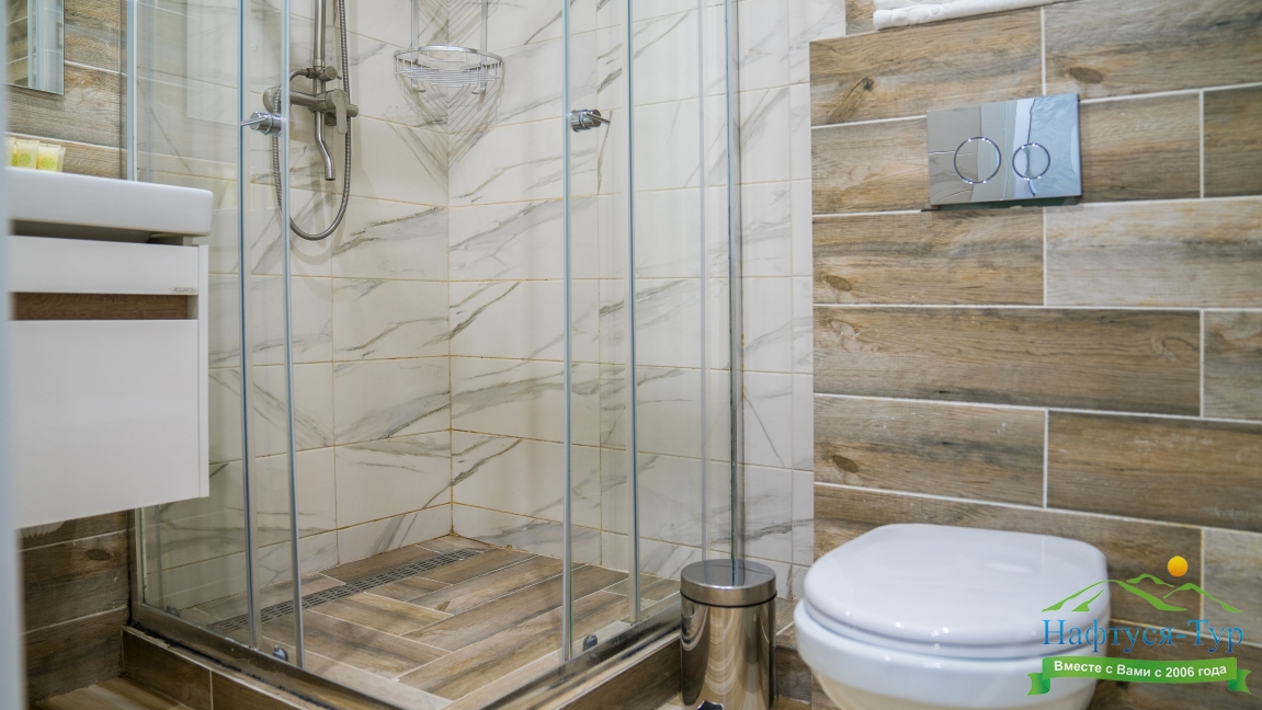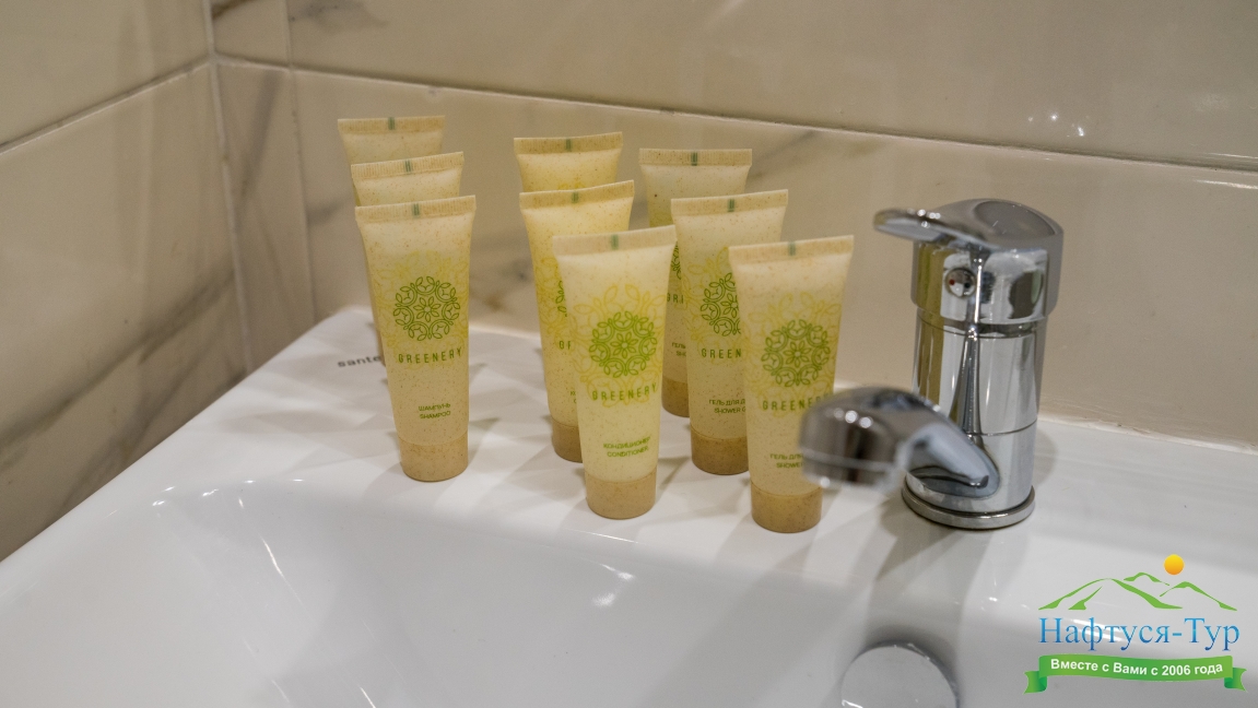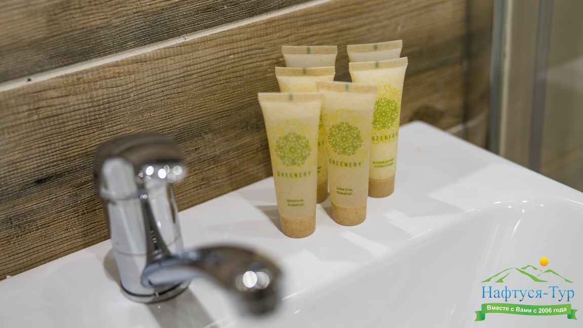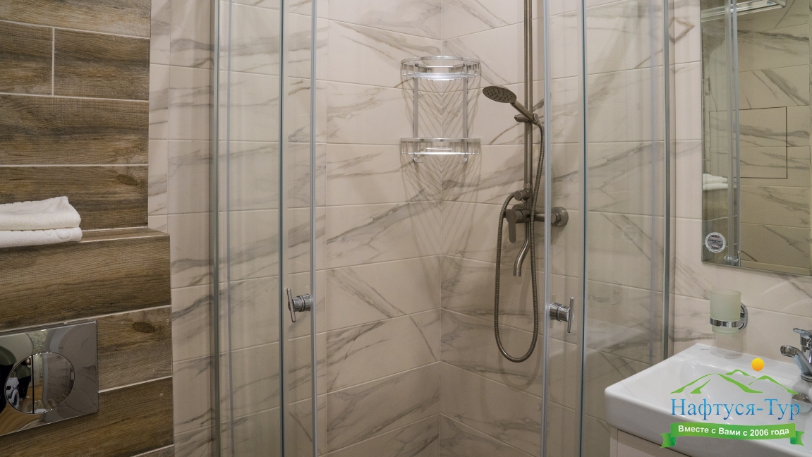 с душем (поддон), тапочки, туалетные принадлежности, фен, халат