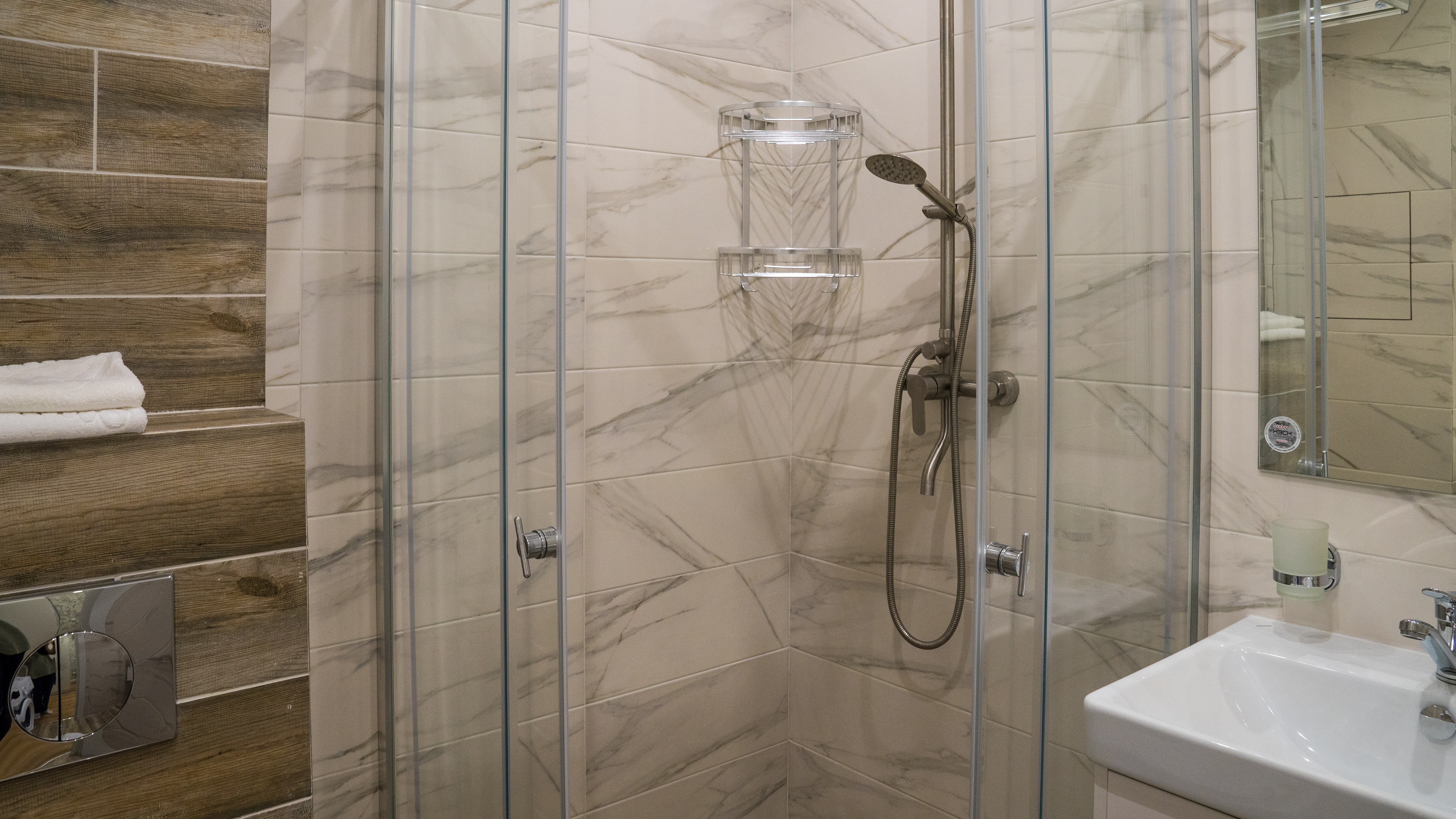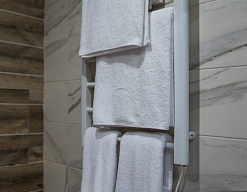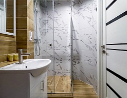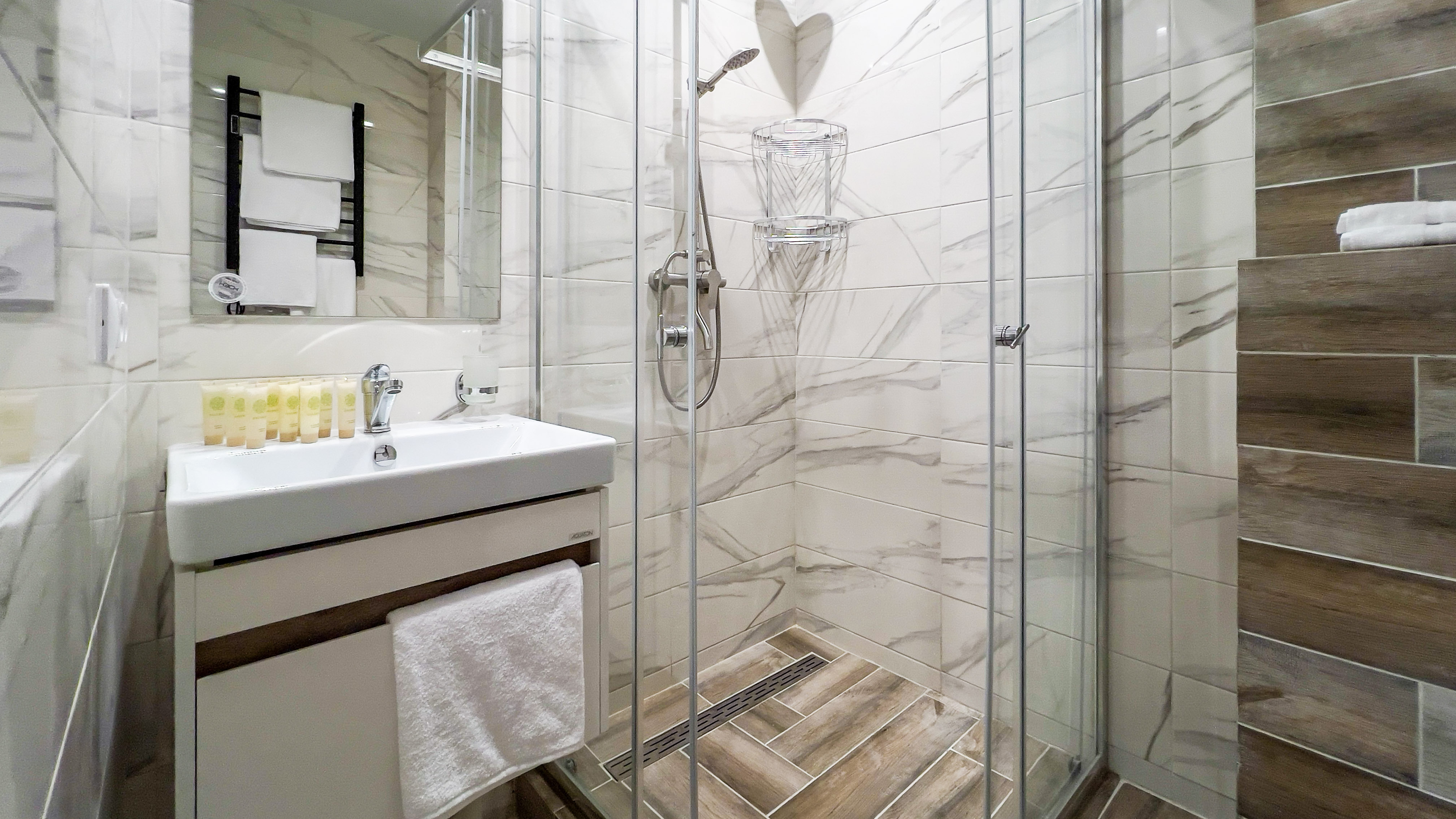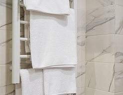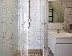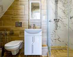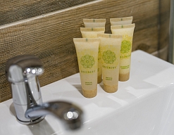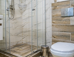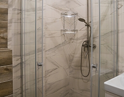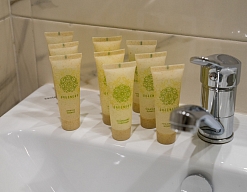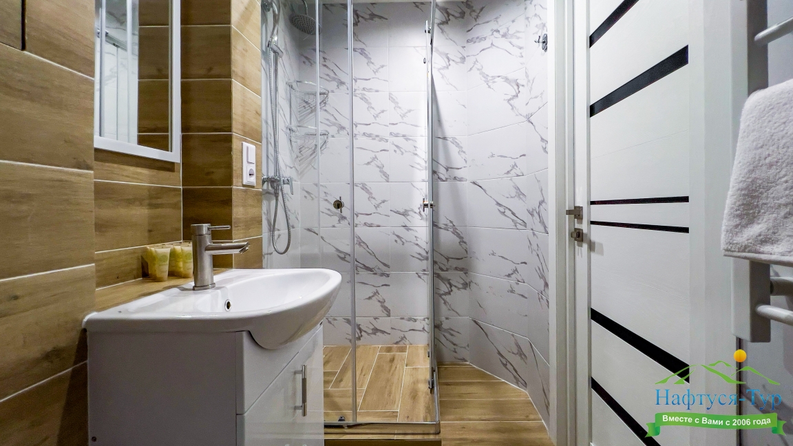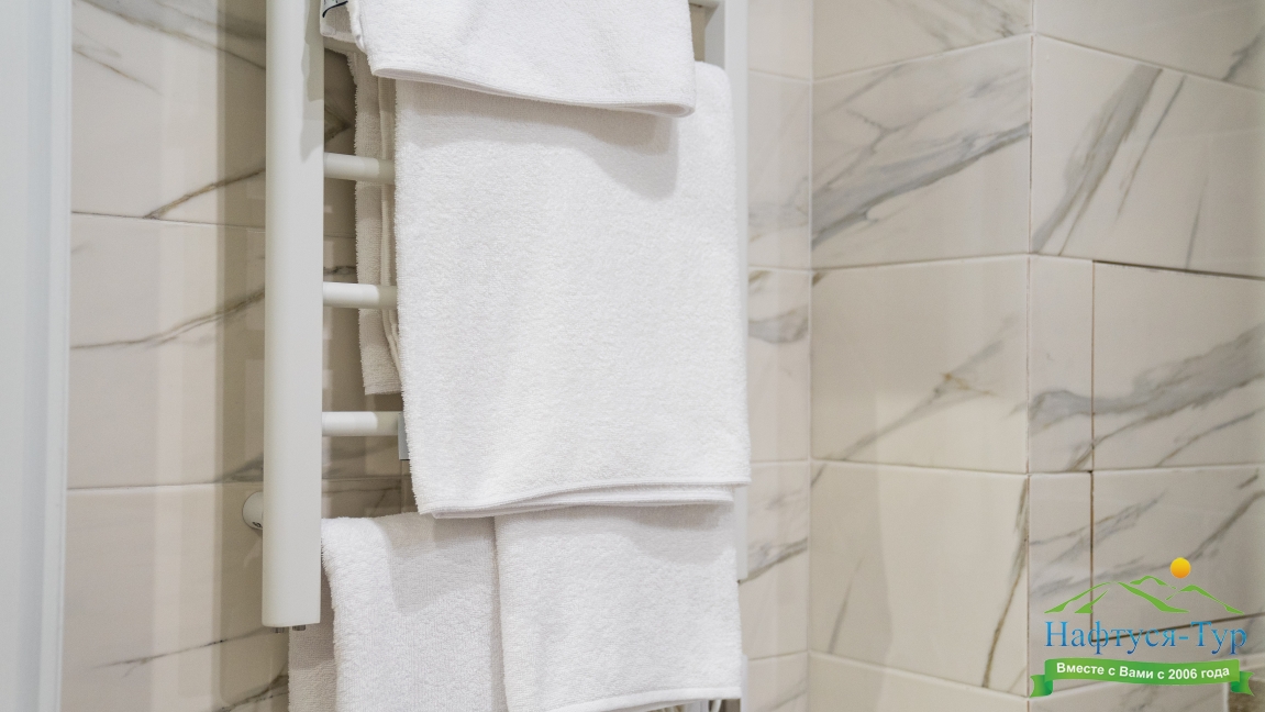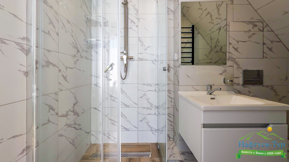с душем (поддон), тапочки, туалетные принадлежности, фен, халат