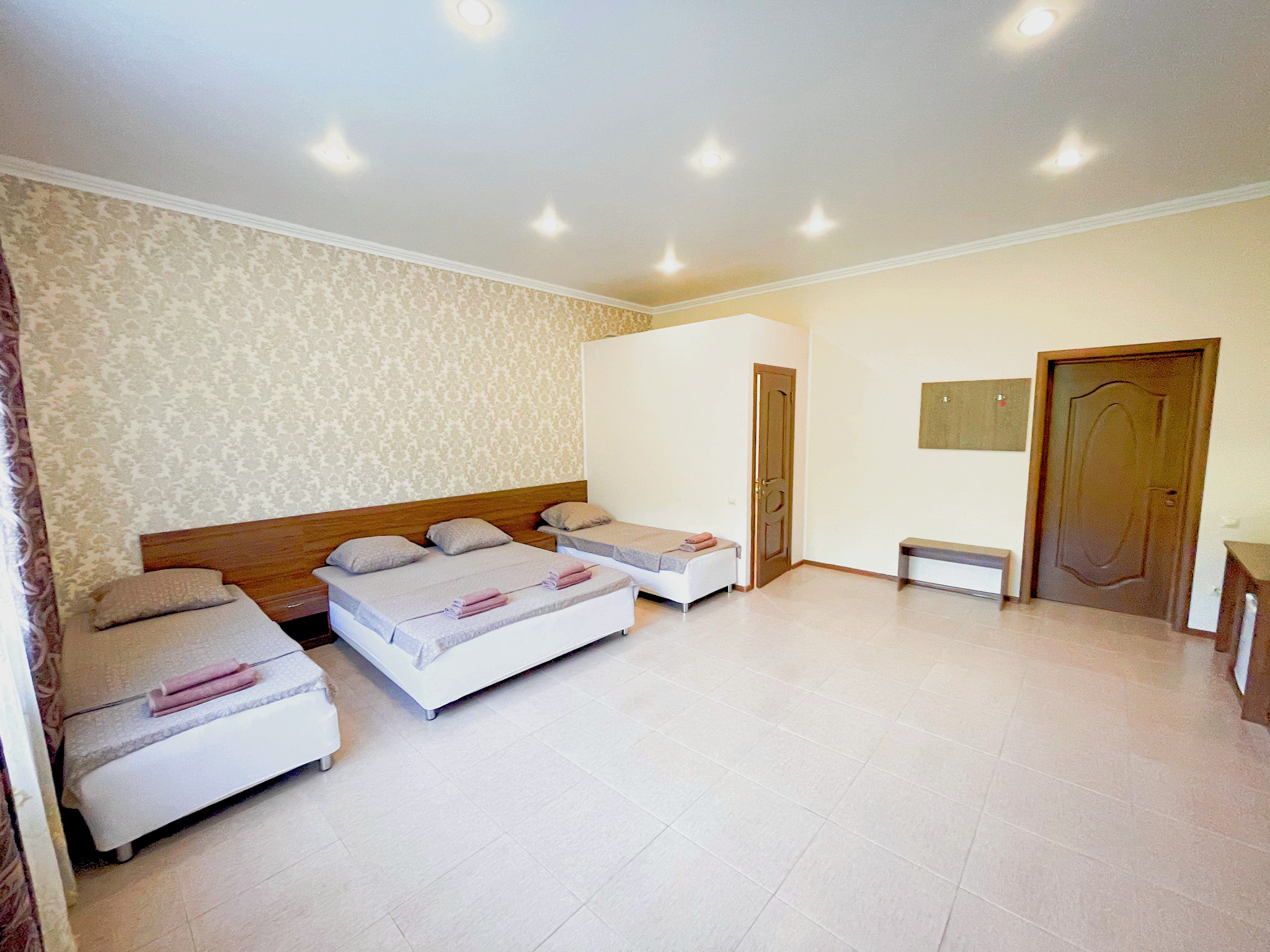 вешалка, зеркало, кровати односпальные, кровать двуспальная, прикроватные тумбочки, стол, тумба, шкаф