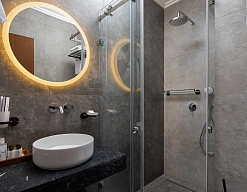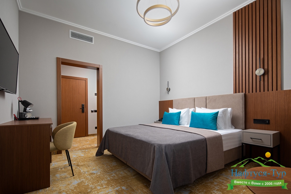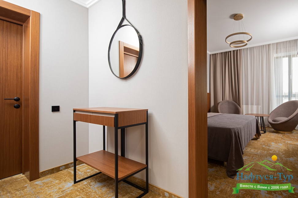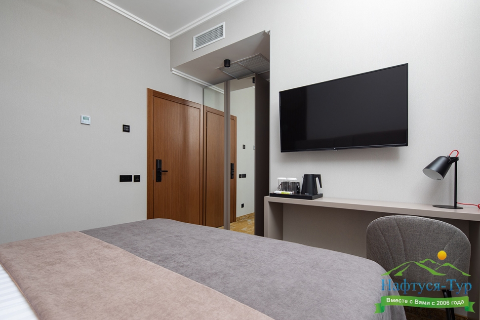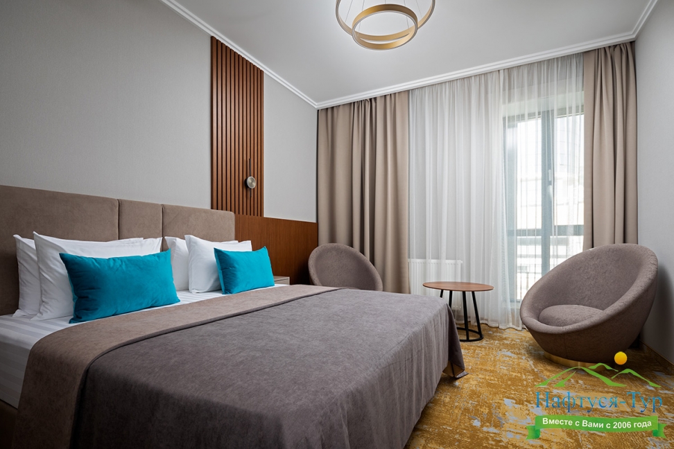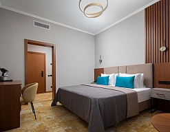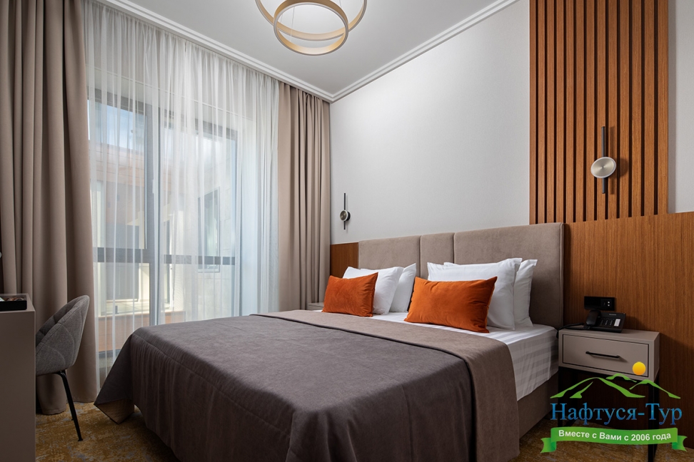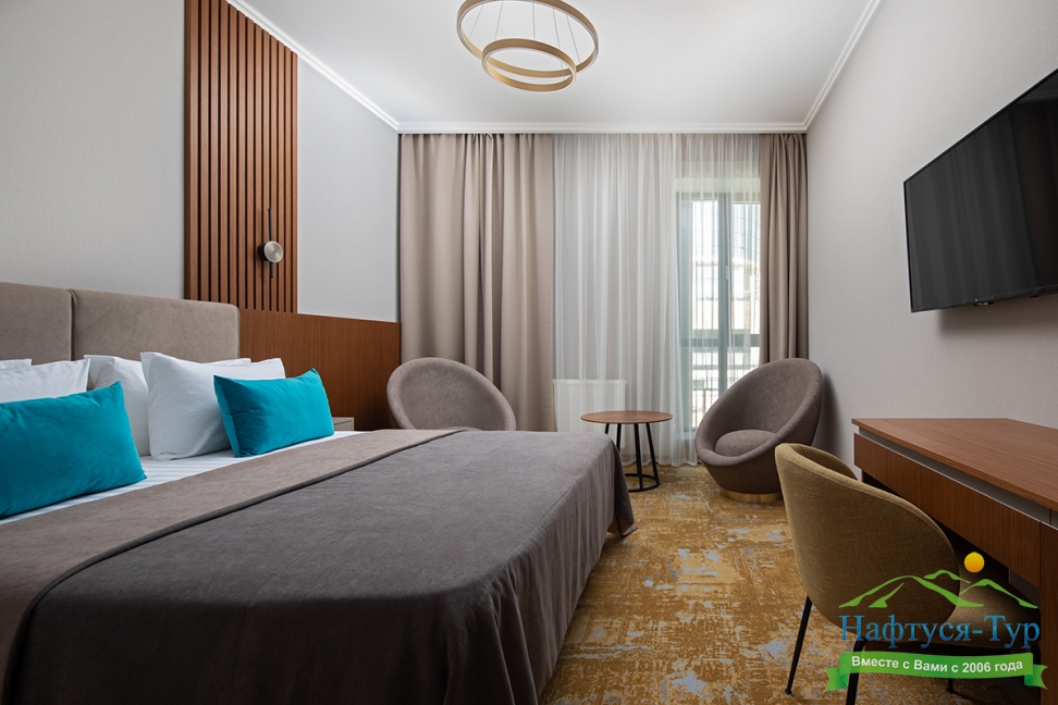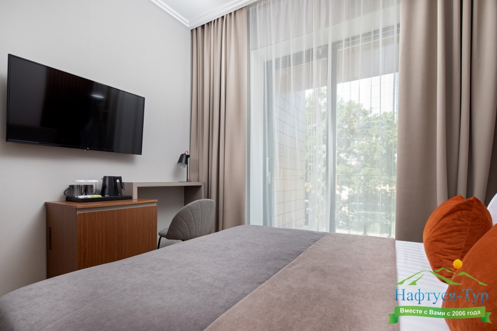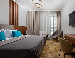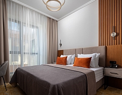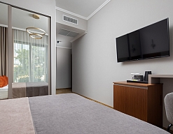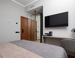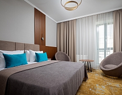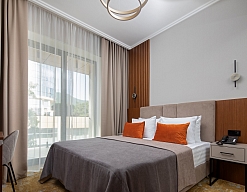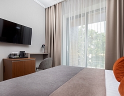 Отель "Атмосфера" - современный, элегантный отель в стиле хай-тек, удивляющий простотой и одновременно строгостью форм. Практичность обстановки с минимумом декора, но в то же время высокая функциональность- отличительная черта дизайна интерьера отеля и ресторанов на территории.