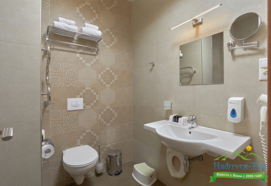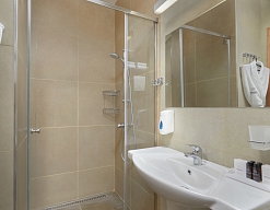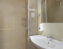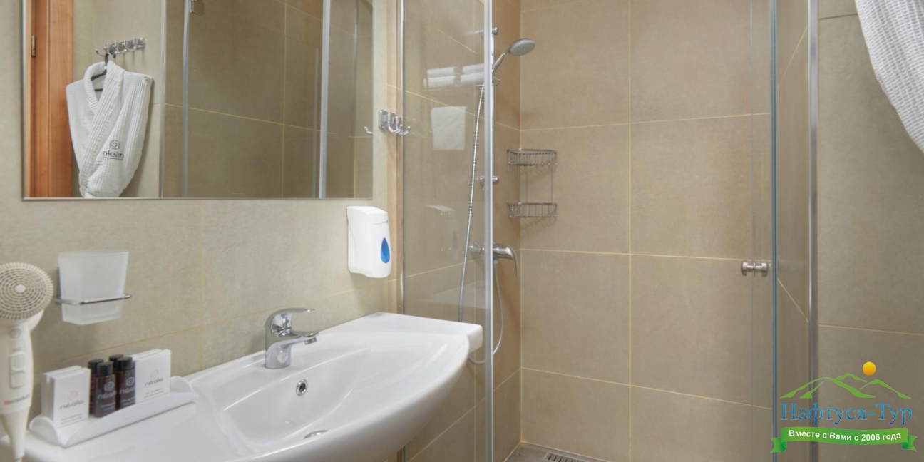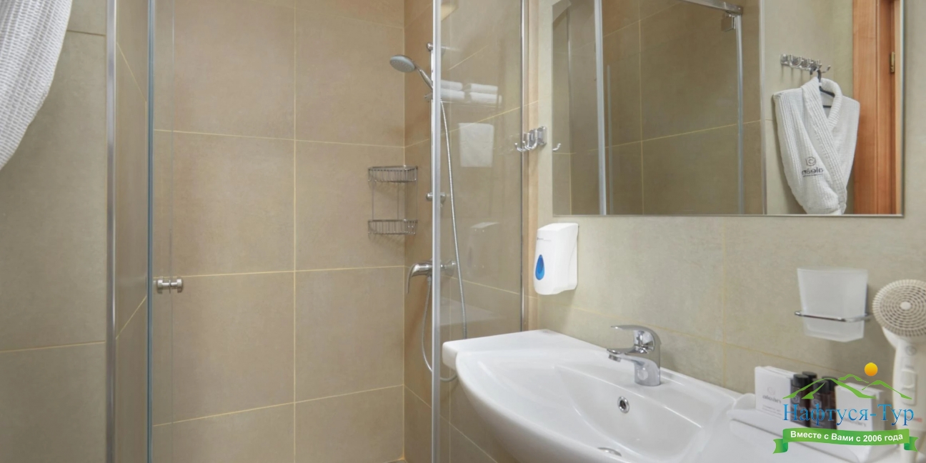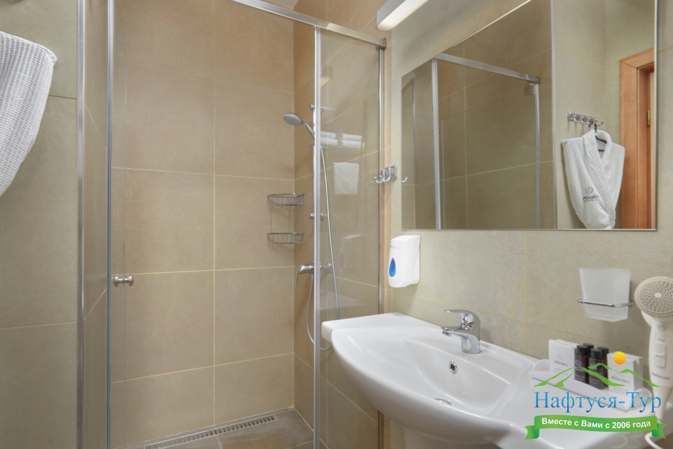 с душевой кабиной, тапочки, туалетные принадлежности, фен, халат