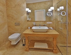 с душем, тапочки, туалетные принадлежности, фен, халат