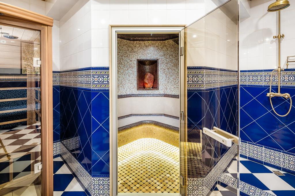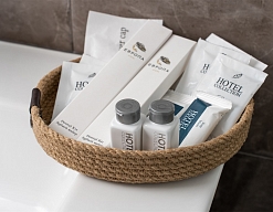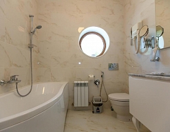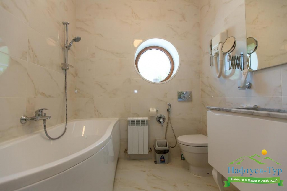 с ванной, тапочки, туалетные принадлежности, фен, халат