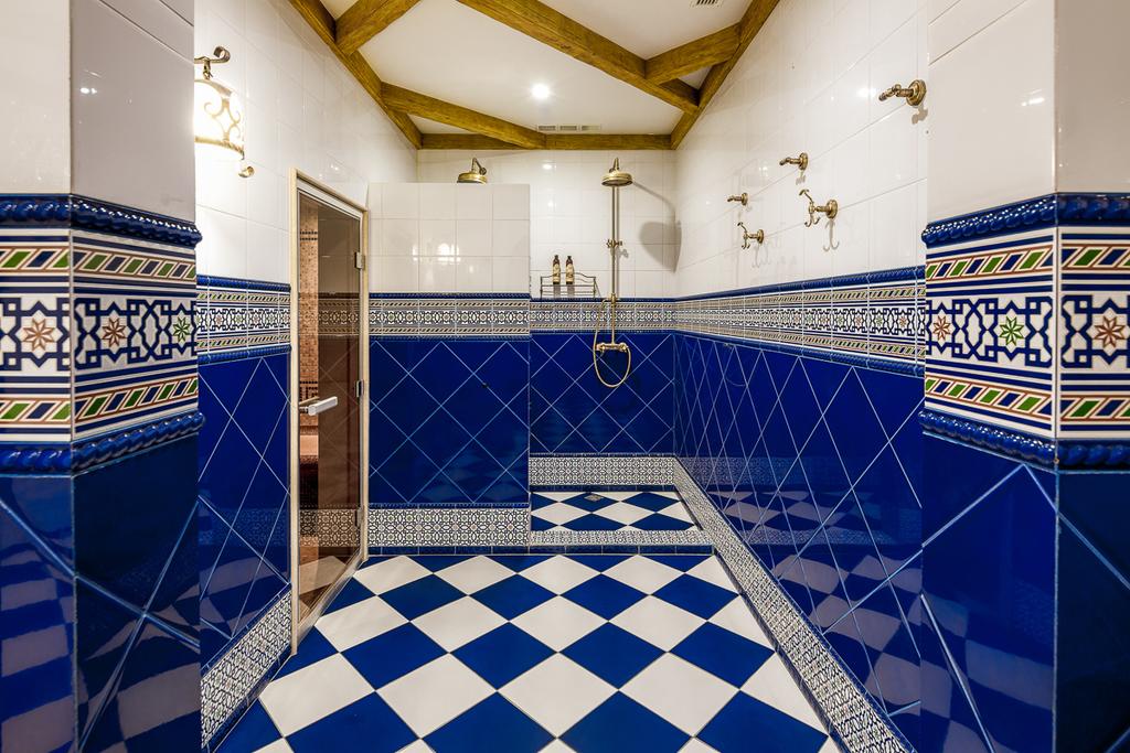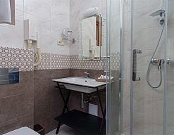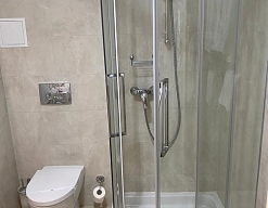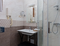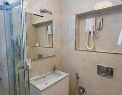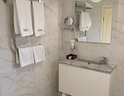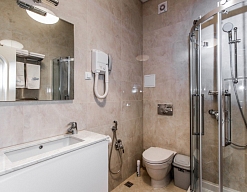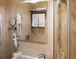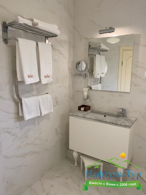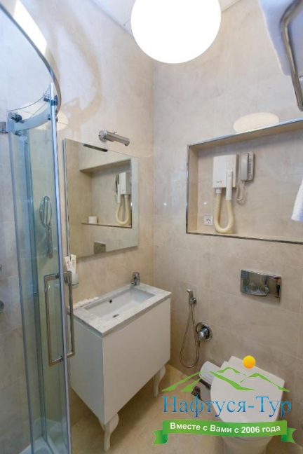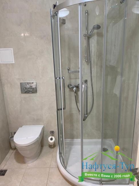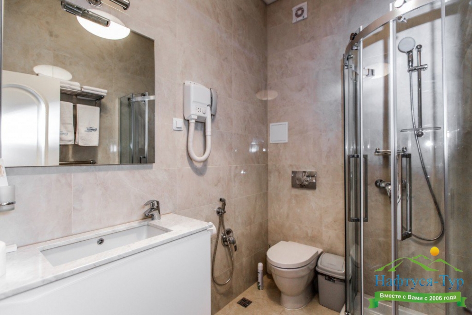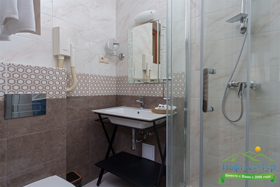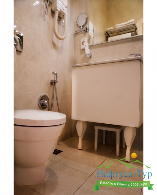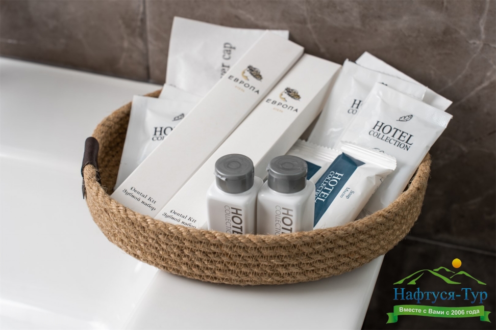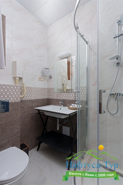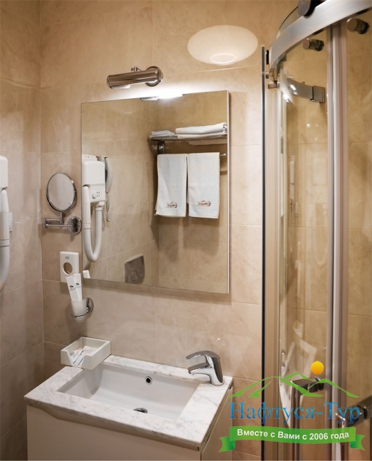 с душем, тапочки, туалетные принадлежности, фен, халат