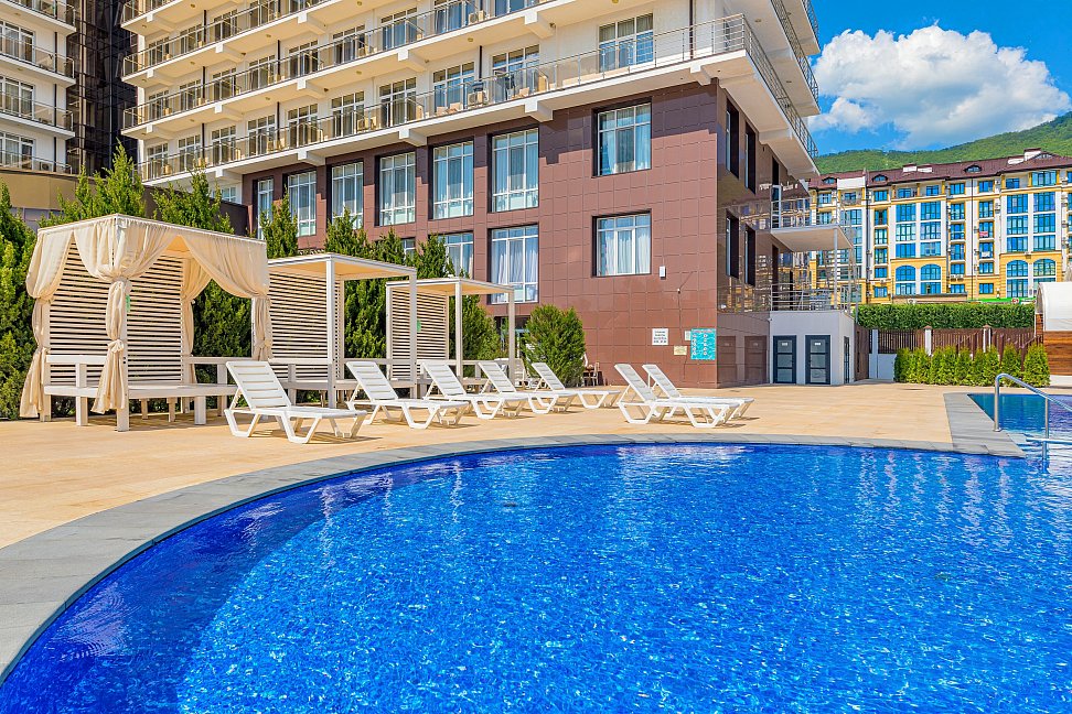 Отдыхала в пансионате в сентябре. Осталась очень довольна. Но он отменил полётную программу на сентябрь. Мы оставили бронь на пансионат, а билеты сами взяли до Геленджика, а не до Анапы. По приезду нам предложили номер 105, полулюкс. Это первый этаж сзади ресепшен. Есть еще нулевой этаж, так что это как бы второй этаж. Но мы на сайте читали, что за доплату можно получить номер с видом на море. Попросили и нас заселили на последний 7-й этаж с прекрасным видом!!! Правда, чек на эти две тысячи не дали...Залог взяли только за ключи, при отъезде вернули. За карточки на полотенца залог не брали. Попросили только ваучер и паспорт. Никаких сертификатов о прививке. Мы сами спросили. Там указана электронная почта, куда надо переслать сертификаты. Выдают браслеты для опознания в автобусе и на пляже. Номер отличный с балконом. На всех балконах веревочка с прищепками. В номере сейф (нигде не упоминается) бесплатно, чайник и чашки. Воду и заварку покупайте сами. Есть холодильник, но уходя свет выключается и холодильник тоже! Вход в столовую и за ворота по ключу, поэтому не получится оставить ключ, чтобы холодильник работал. Бассейн отличный, большой, лежаков много. Вода постоянно подогревается. Там плавает градусник и можно посмотреть температуру. С детьми аниматоры в какие то игры играли. Танцы и музыка до 10-ти вечера. Очень душевно. Автобус на пляж курсирует, хотя писали, что из-за пандемии отменили. В холле можно приобрести экскурсии и приезжают продавцы с разным товаром. Мы взяли экскурсию в Гуамское ущелье и термальные источники. Очень понравилось, но сухого пайка пансионат не дает!!! Уехали мы в 6 утра, а вернулись в 23 вечера. Были неделю, погода радовала, +25 днем, +23 вода. Сами съездили в Новороссийск, посетили Малую землю. Рядом Сафари-парк. Это огромный зоопарк и там же канатная дорога. 25 минут поднимались на канатке на 600 м над уровнем моря. всем довольны! Всем спасибо!!