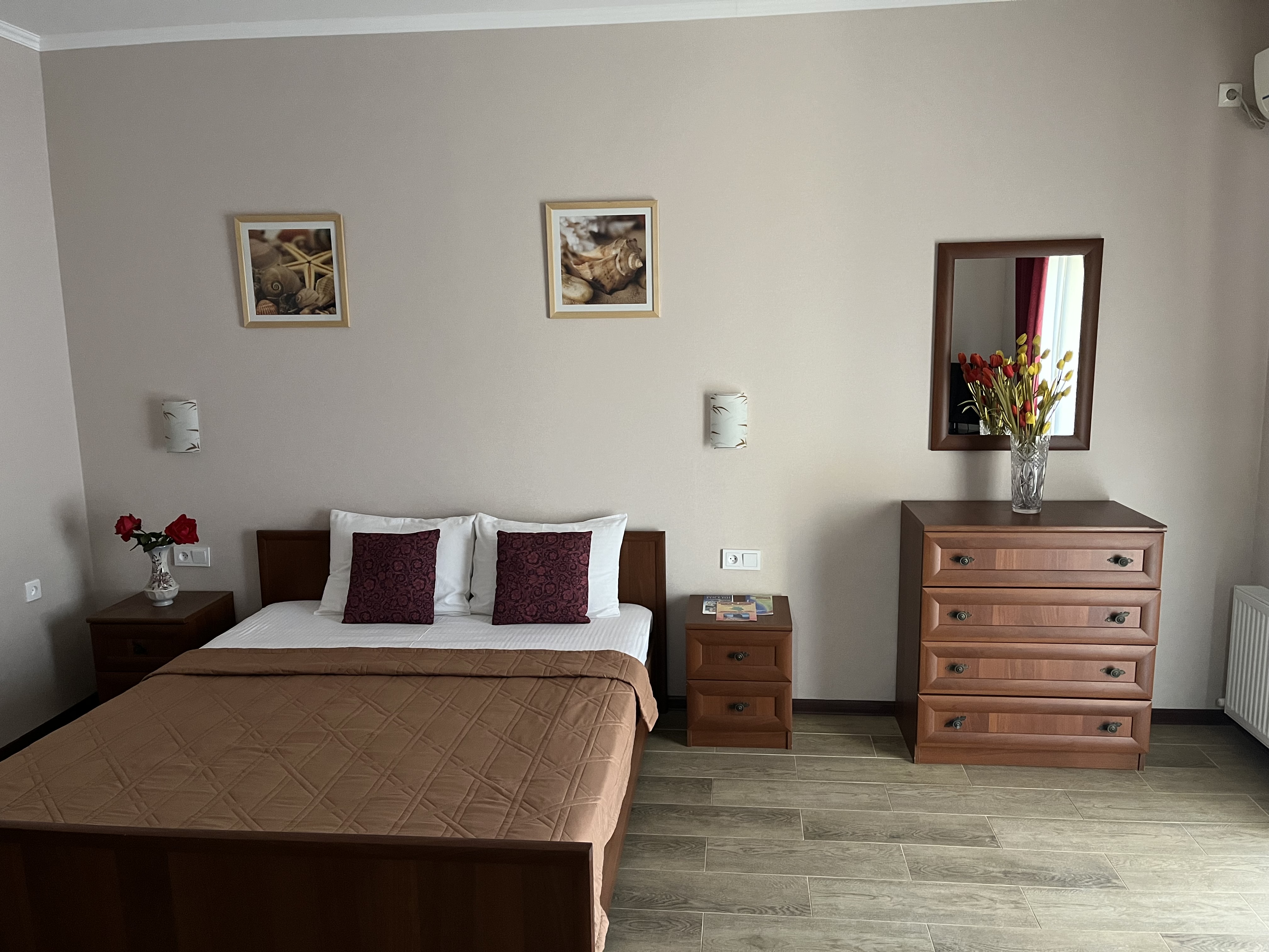 вешалка, диван раскладной, зеркало, комод, кровать двуспальная, прикроватные тумбочки, стол, стулья, шкаф