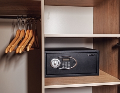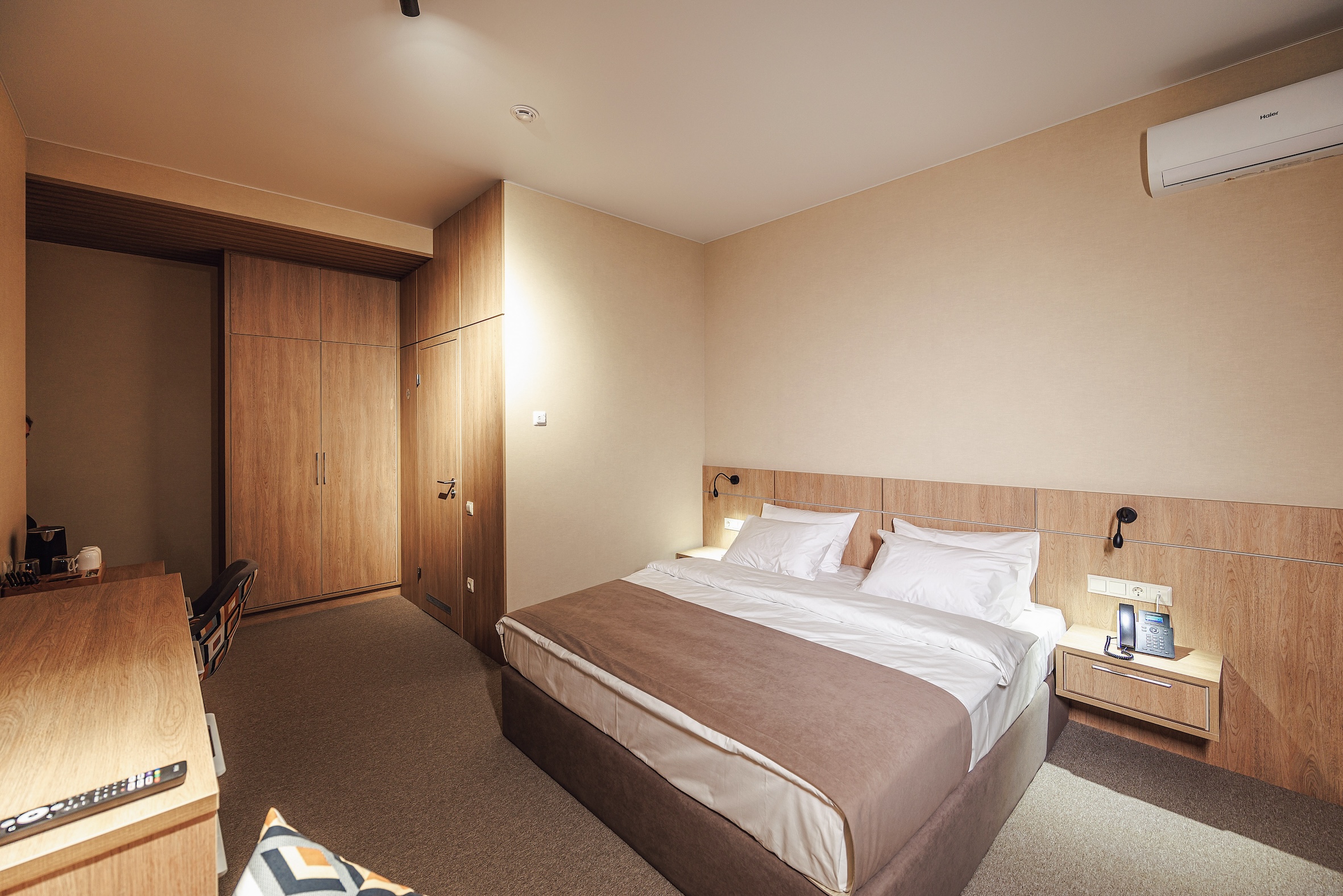 кондиционер, набор посуды, сейф, телевизор, телефон, холодильник, электрочайник