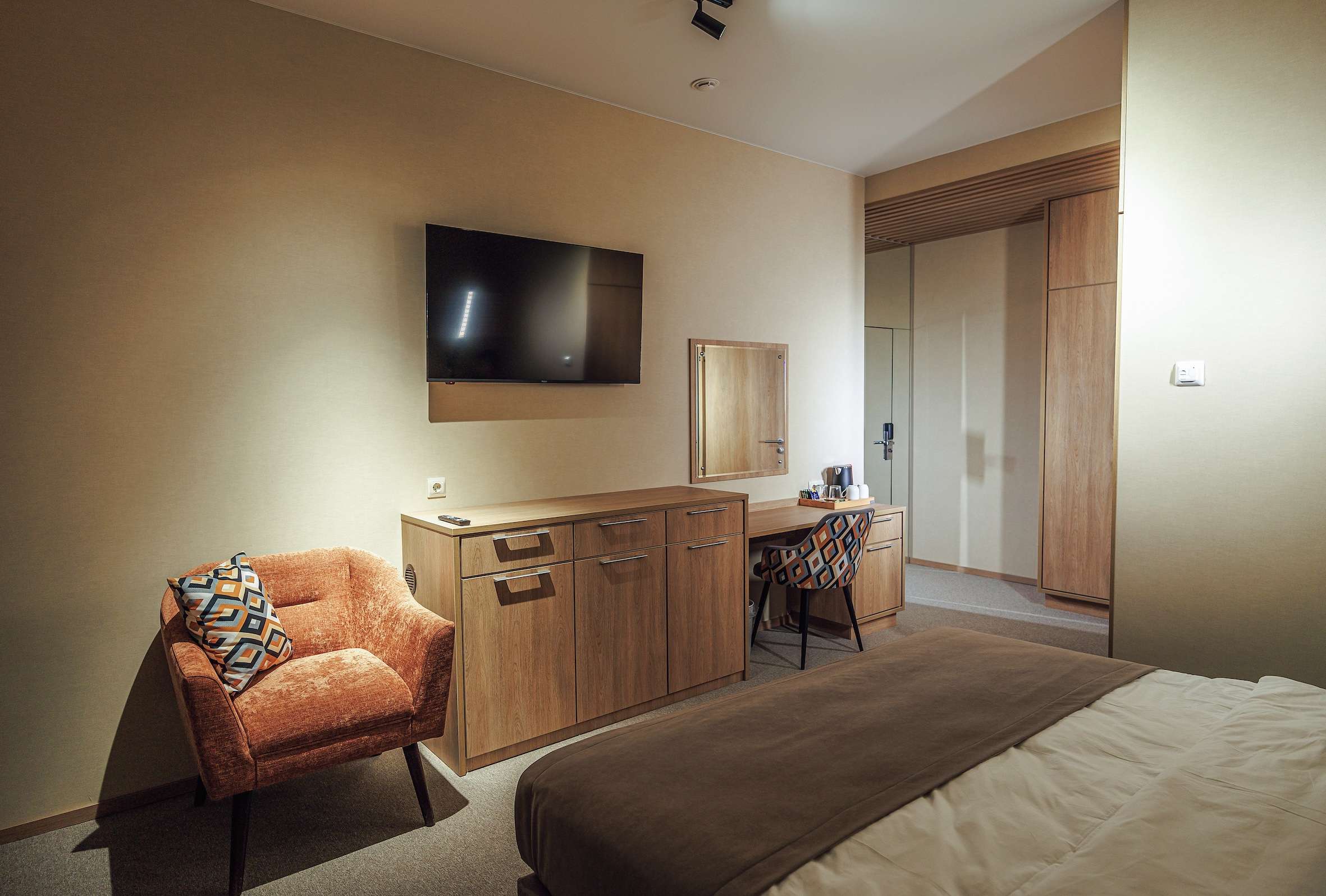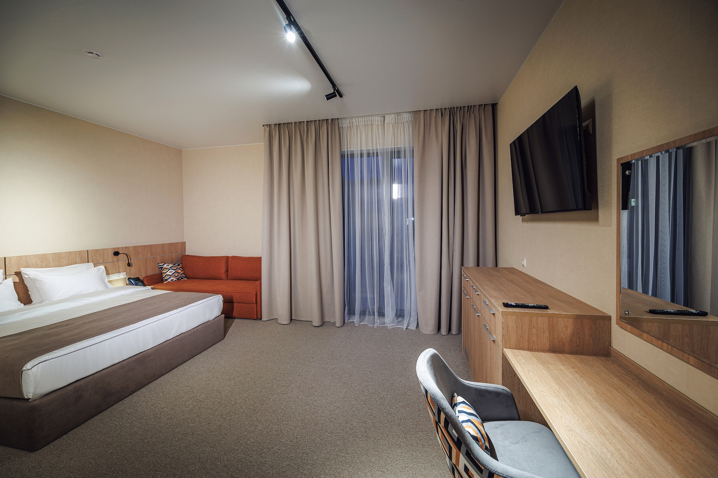 вешалка, диван раскладной, зеркало, ковровое покрытие, кресло, кровать двуспальная, прикроватные тумбочки, стол, столик журнальный, шкаф