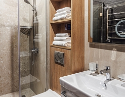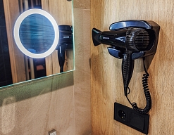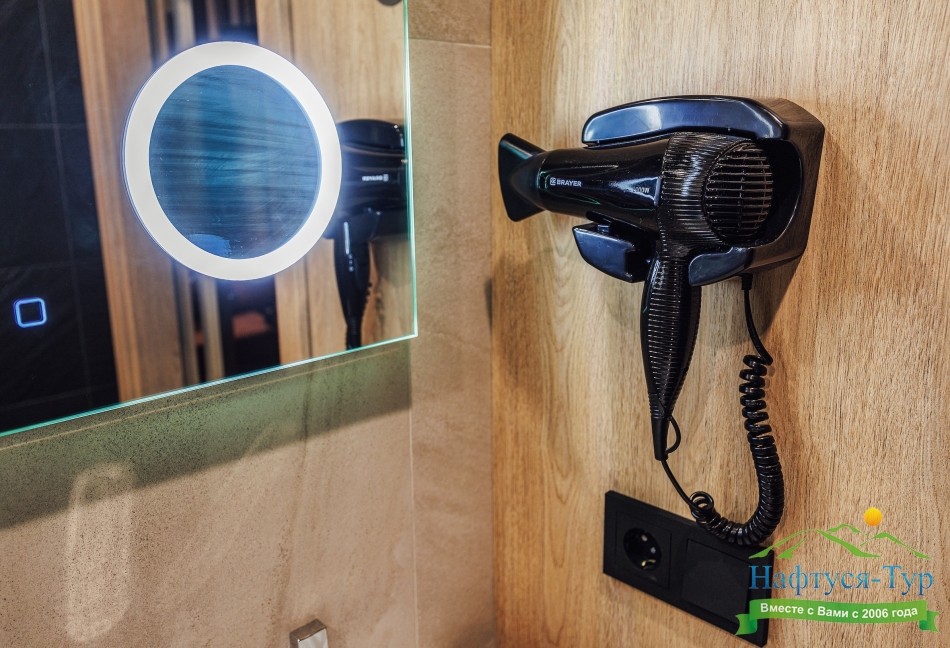 с душевой кабиной, туалетные принадлежности, фен