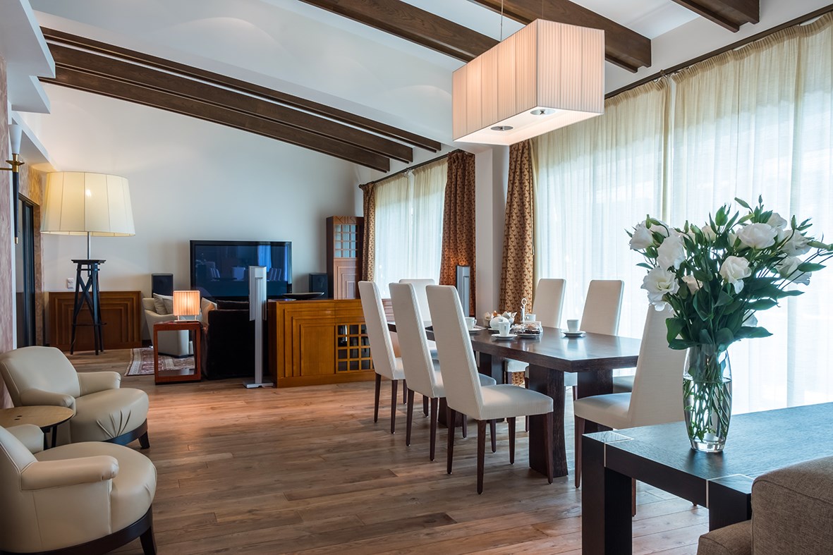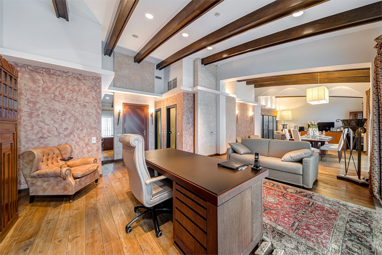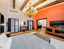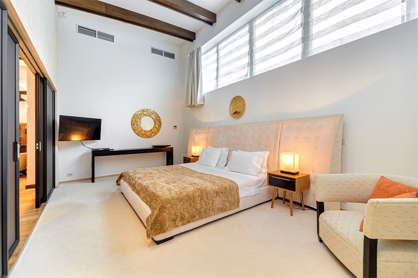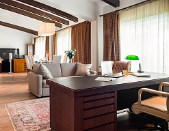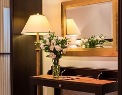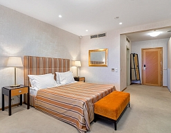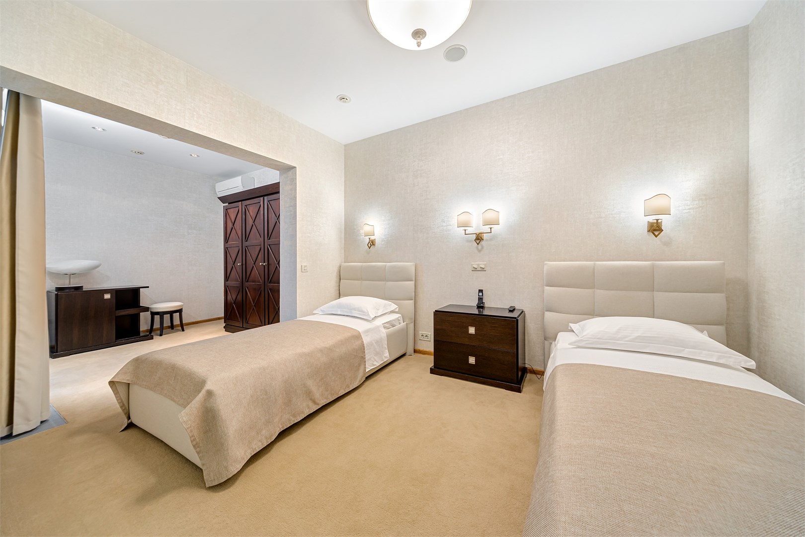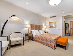 вешалка, зеркало, кресла, кровати полутороспальные, кровать двуспальная, прикроватные тумбочки, пуфик, стол, столик журнальный, стулья, шкаф