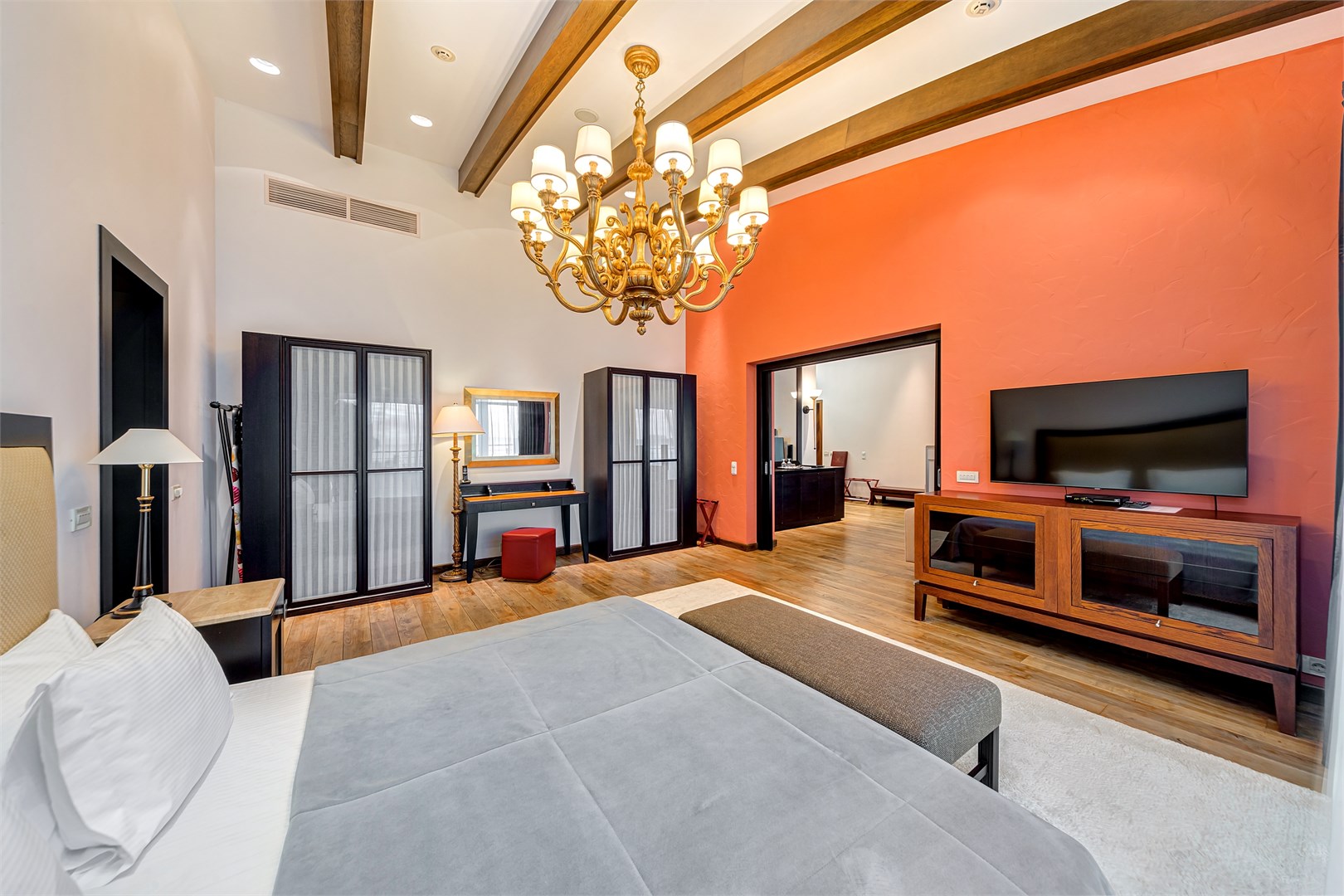 вешалка, зеркало, кресла, кровать двуспальная, прикроватные тумбочки, пуфик, стол, столик журнальный, стулья, тумба, шкаф