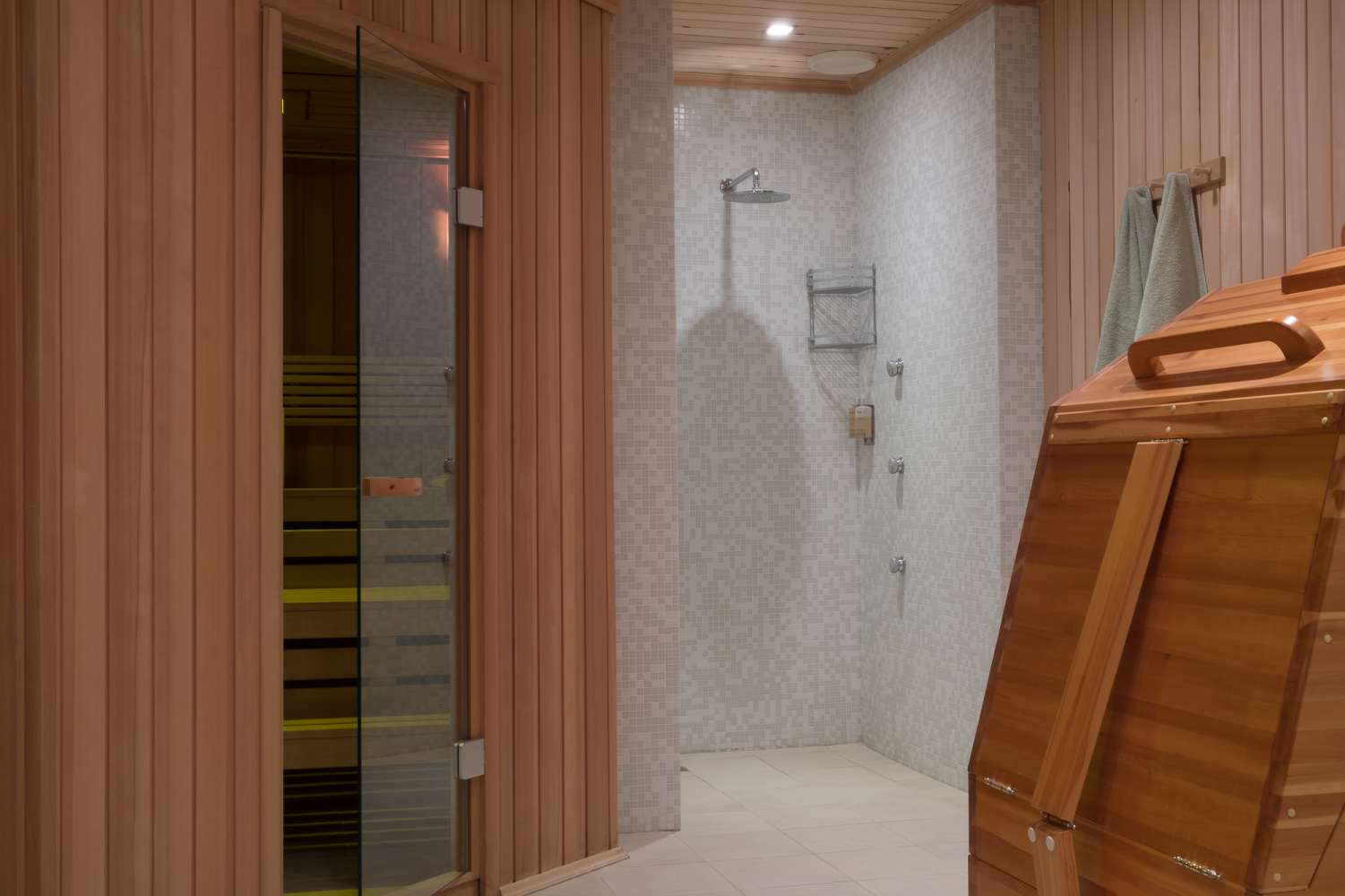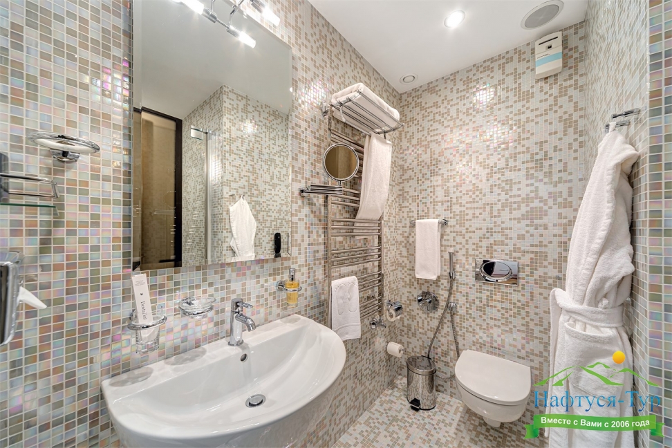 биде, с душевой кабиной, тапочки, туалетные принадлежности, фен, халат