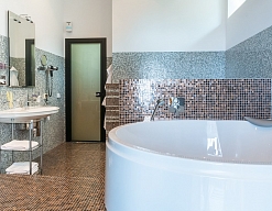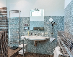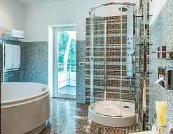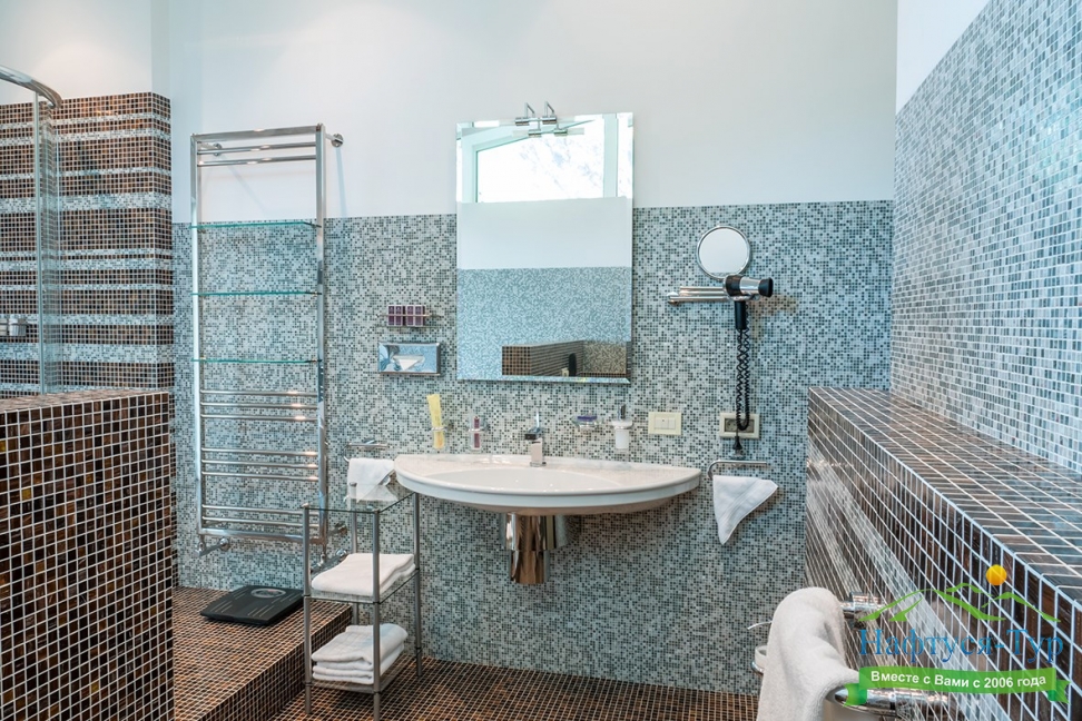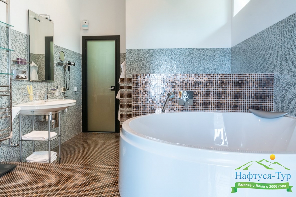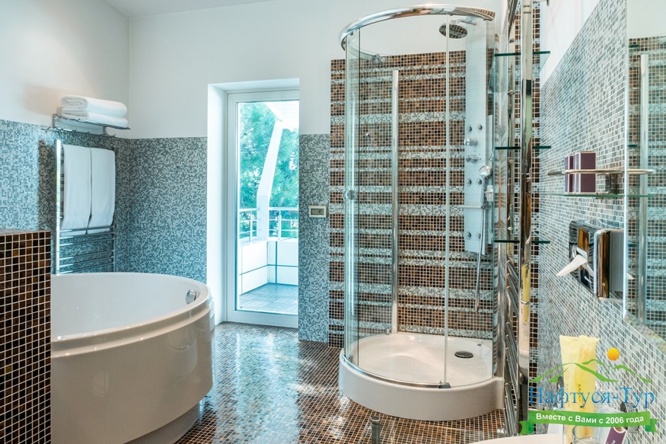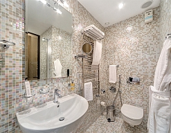 с ванной, с душевой кабиной, тапочки, туалетные принадлежности, фен, халат