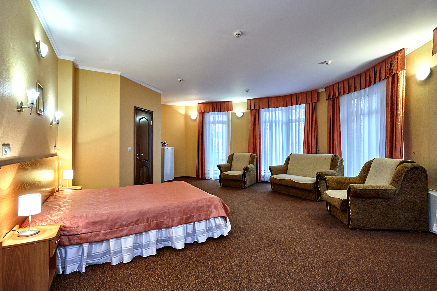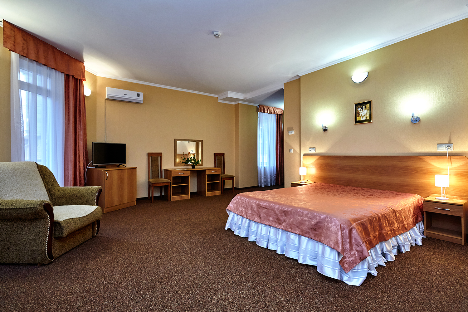 вешалка, диван раскладной, зеркало, кресло-кровать, кровать двуспальная, прикроватные тумбочки, стол, стулья, шкаф
