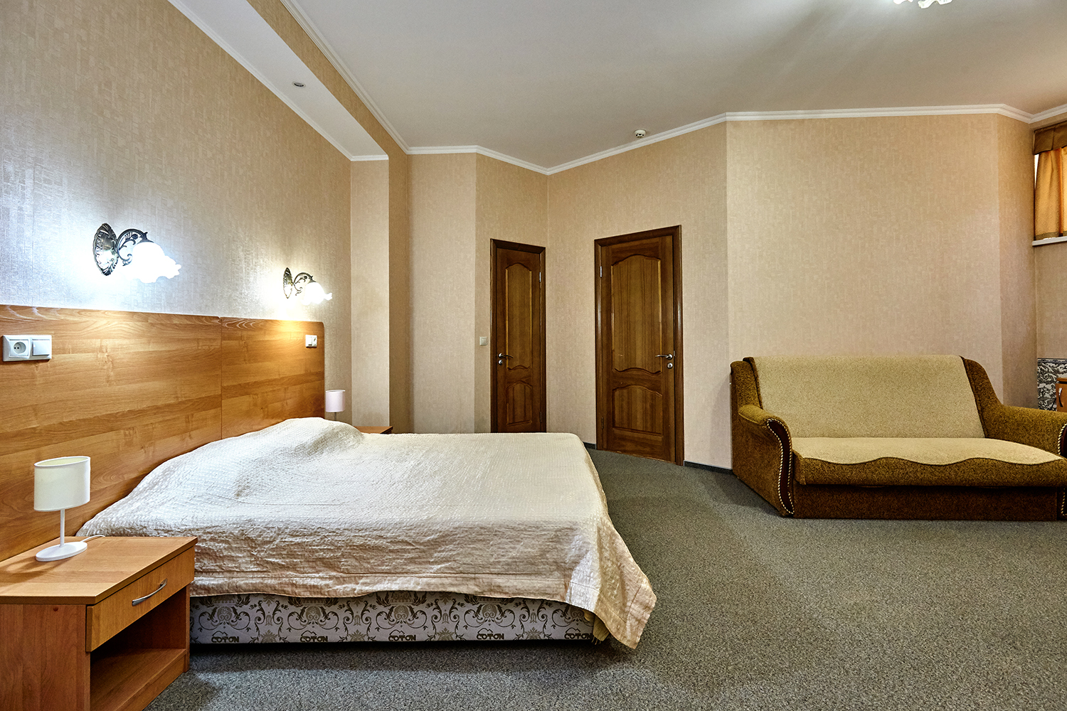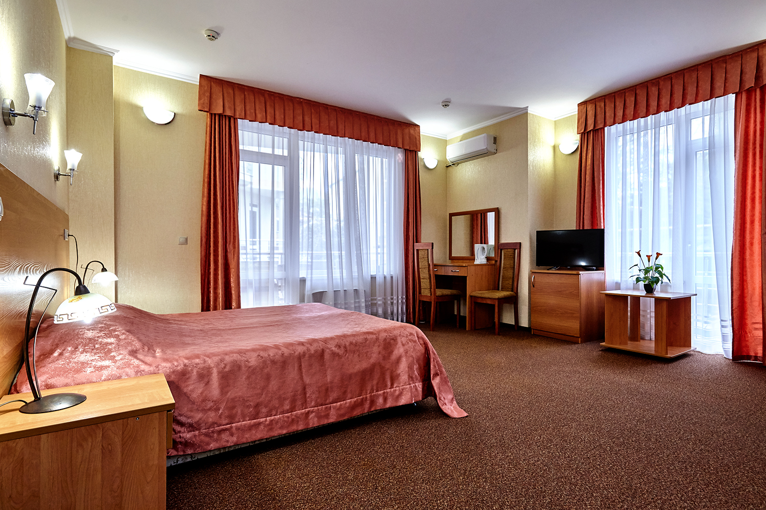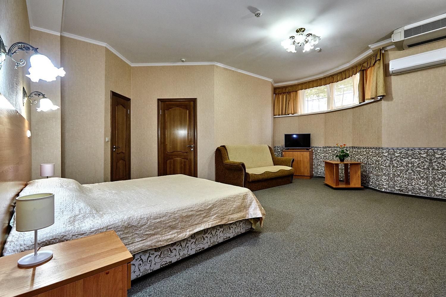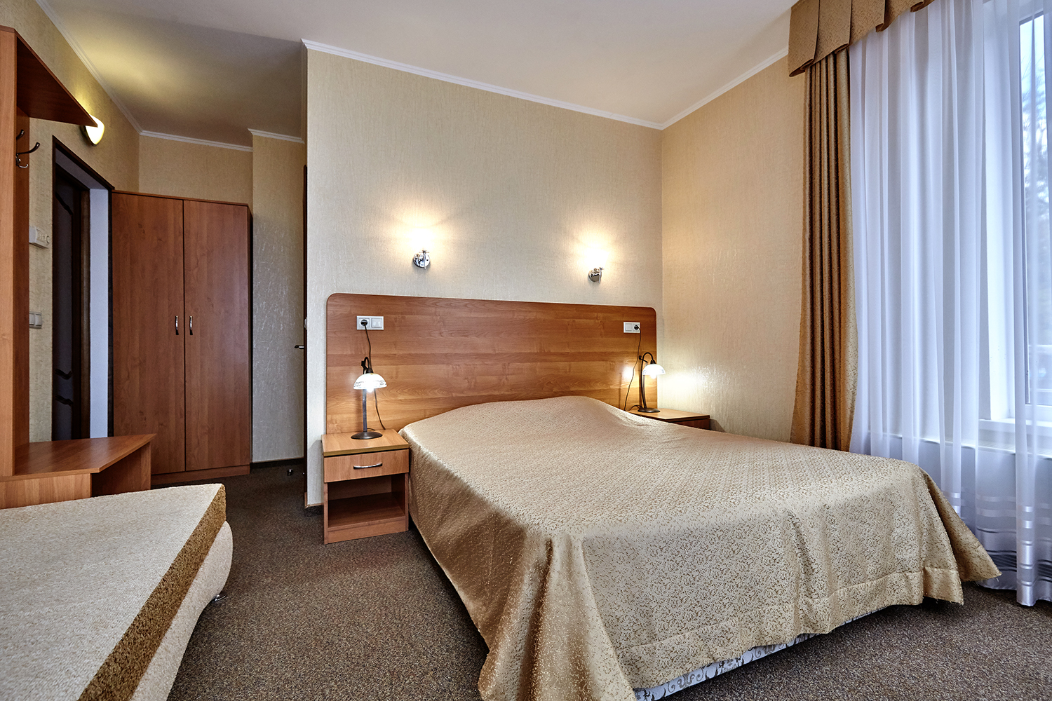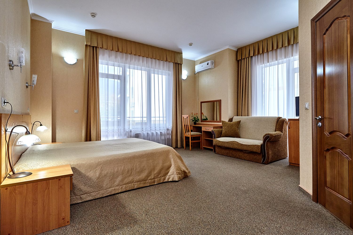 вешалка, диван раскладной, зеркало, кровати односпальные /одна двуспальная кровать, прикроватные тумбочки, стол, стулья, шкаф