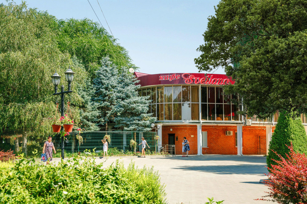 Второй этаж здания – кафе «Светлана»: 3 зала. Общая возможность размещения– 180-200 чел. Кафе «Светлана» на берегу бассейна имеет летние площадки (50-80 мест).