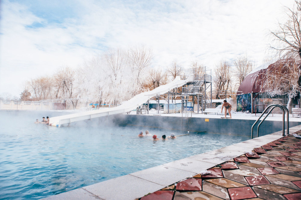 Открытый Бассейн (размер 50м*25м, глубина 140см.) наполняется термальной водой йодо-бромная кремнистая высокоминерализованной (12 гр/л) Лабинское месторождение (аналог воды курорта Висбаден, Германия). Температура воды регулируется нами от 28гр. (летом) до 34-35гр. (зимой).